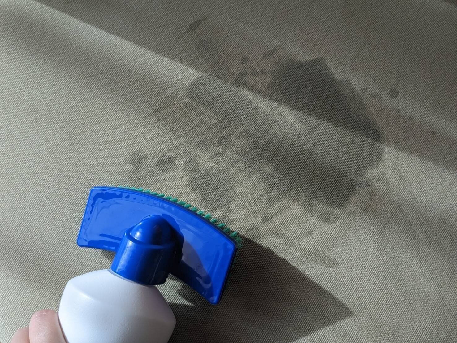 1.汚れが気になる布製品を付属のブラシでこすって3分放置