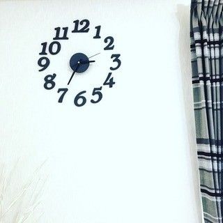 森さや香さんはモノトーンで統一されている空間に、黒の時計をプラス。時計を取り付けたことでお部屋がキリッと引き締まり、洗練された大人の空間に。数字を壁に貼り付けるタイプなので、時計が壁と一体化してなじんでいます。モノトーンのチェック柄のカーテンとも相性バツグン!