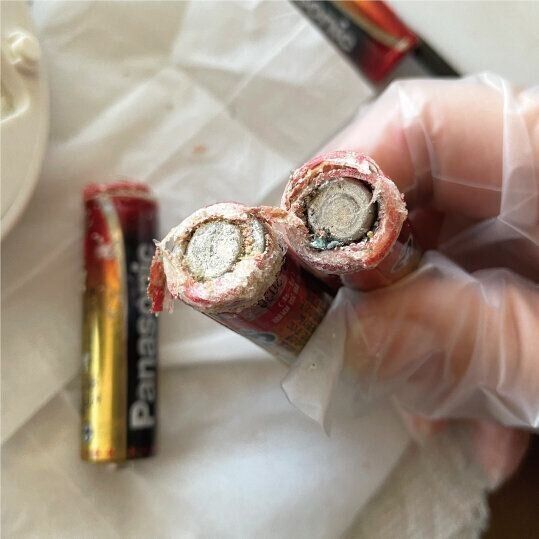 翌朝、改めて電池の液漏れを調べると人体にとって危険なことが判明。液状や結晶が口に入ると嘔吐や頭痛、目に入ると失明の恐れ、皮膚や服に付着すると化学やけどを起こす可能性もあるそうで、改めて家族やモノから離れた場所で確認して良かったと思いました。