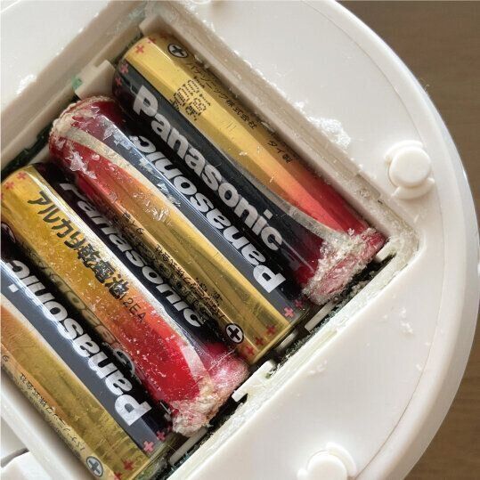先日、夜中に子どもがぐずったので防災と兼用しているライトをつけようとしたら明かりがつかない!電池は入っているはずなのにと蓋を開けてみると液漏れしていたのです。しかも液漏れがかなり前から発生していたのか、白い結晶がびっしり付着していました。