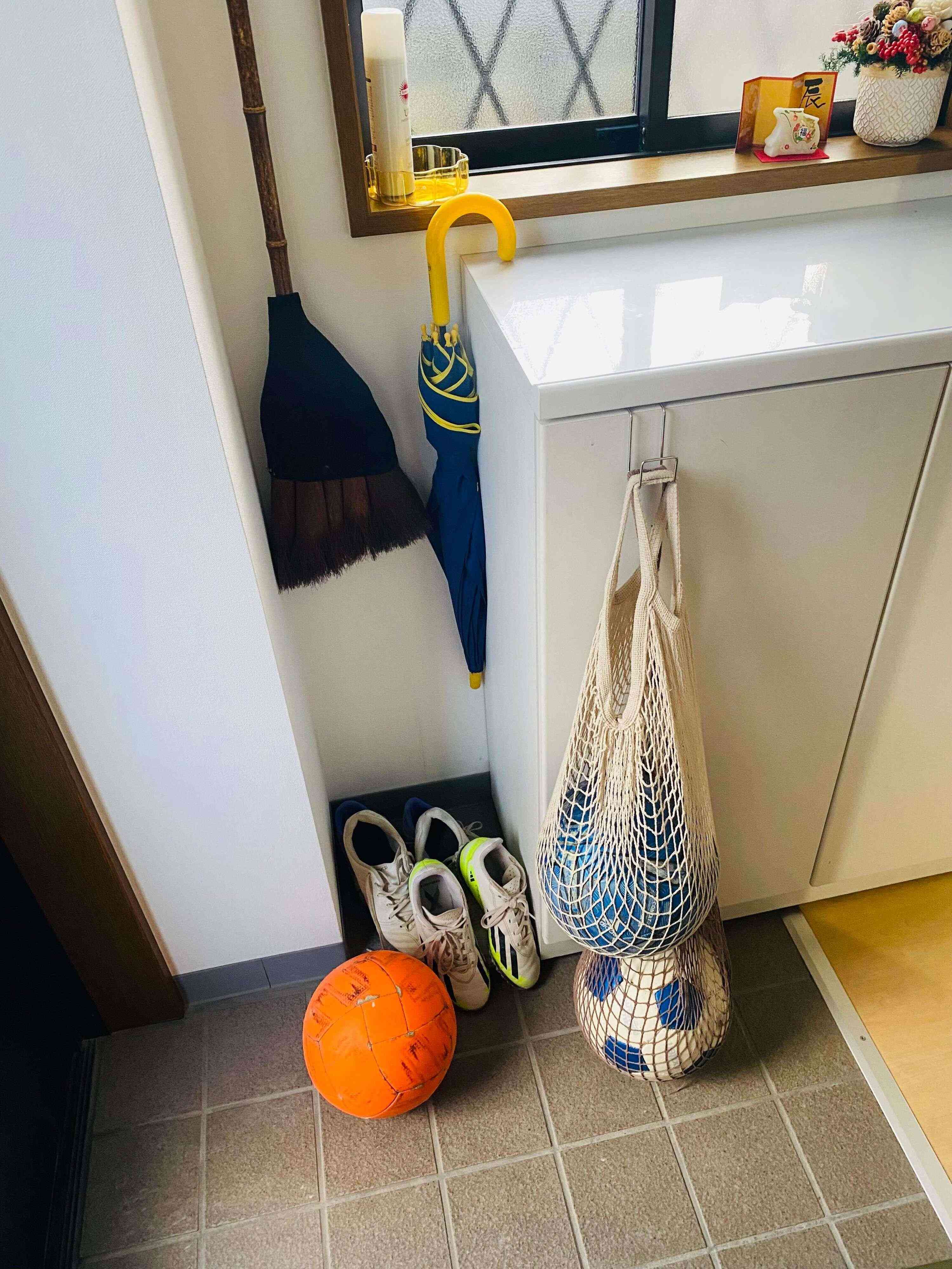 収納するなら出入り口付近か玄関がベストなのですがなんせ我が家の玄関が狭いのでボールを置くスペースがありません。