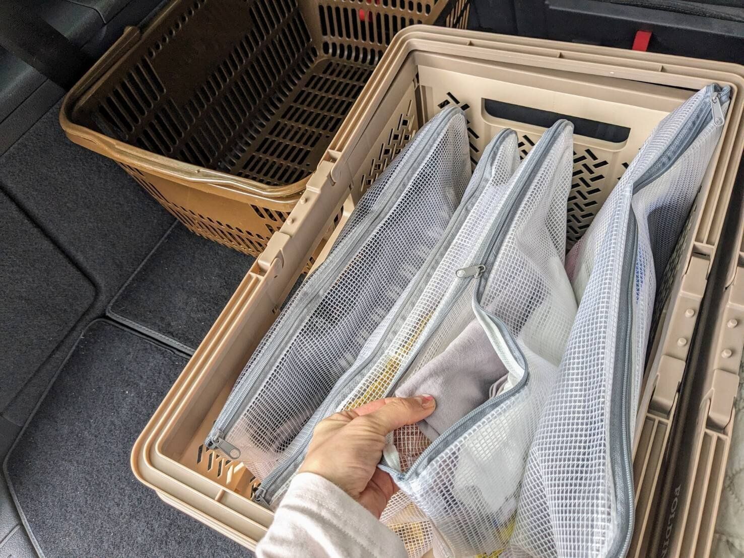 使用頻度の低い「お着替えセット」が入ったバスケットを下に置き、消耗品が収納されたバスケットを上に重ねて収納することで、トランクがスッキリ。