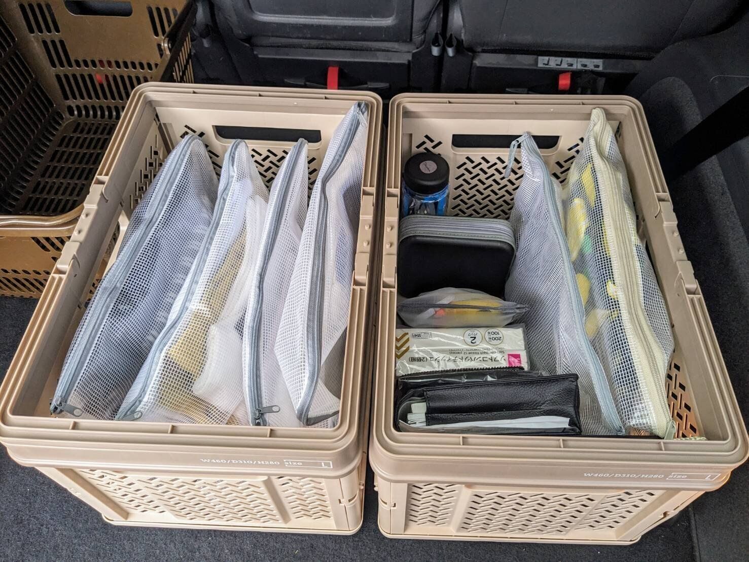 ひとつ目のバスケットには先ほどの「お着替えセット」を!ふたつ目のバスケットには車検証など車関係の書類、ティッシュやゴミ袋などの消耗品、汚れ物を載せる時に敷くレジャーシート、防災ボトルなどを収納しています。