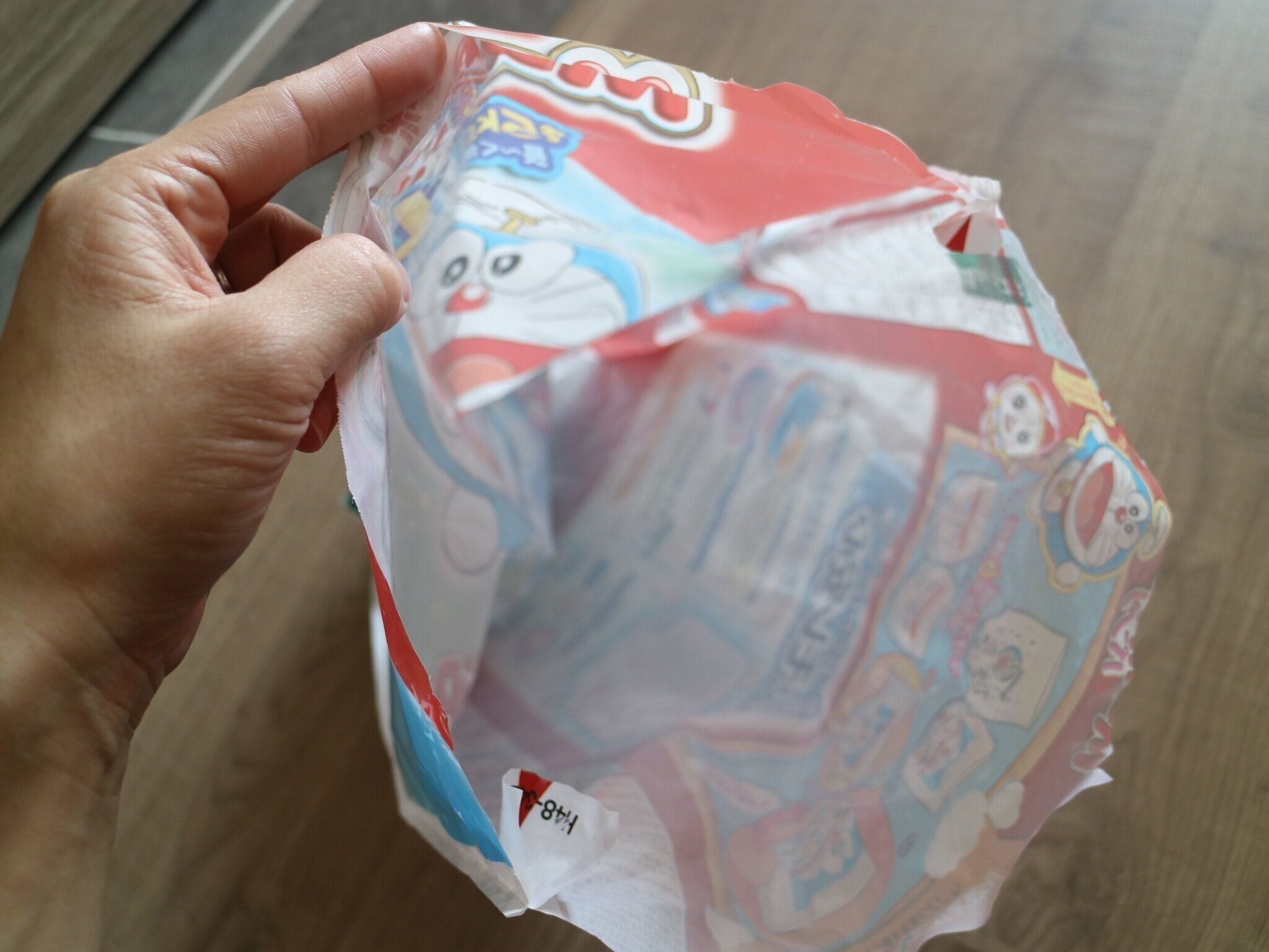 おむつゴミもそうですし、ちょっとした汚れたものだったり名前が書いていて消せないものだったり、この袋に入れてからゴミ袋に入れて捨てるだけ。お米の袋に比べるとすこし薄いですがその分伸びるしけっこう万能。