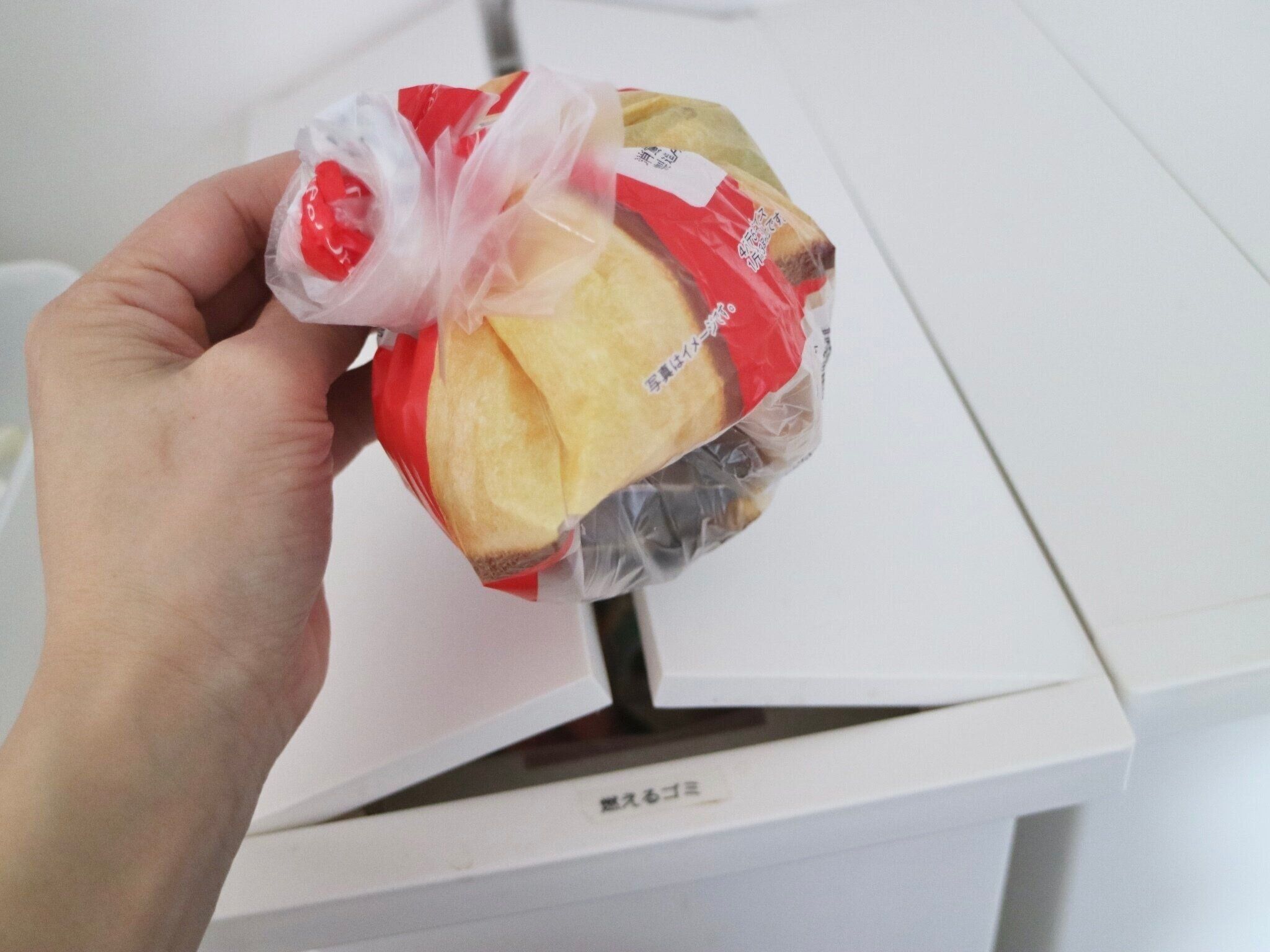 捨てるときはくるっとしばって、ゴミ箱にぽいっ。もちろん捨てる方法はふつうのビニール袋と同じですが、食パンの袋はとにかく頑丈なところがおすすめ。つまようじや割り箸なんかも、袋から突き出ることなく捨てられますよ。