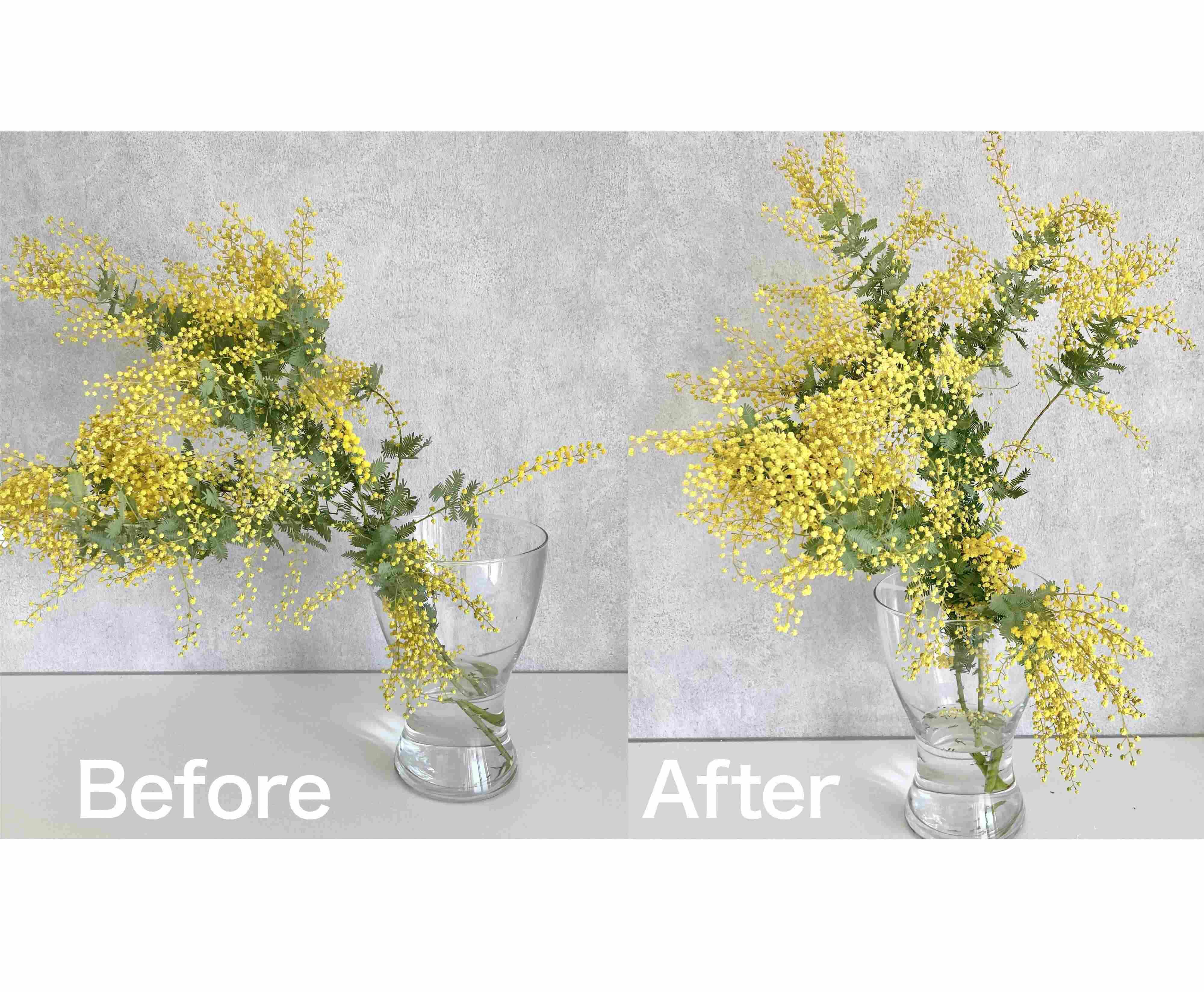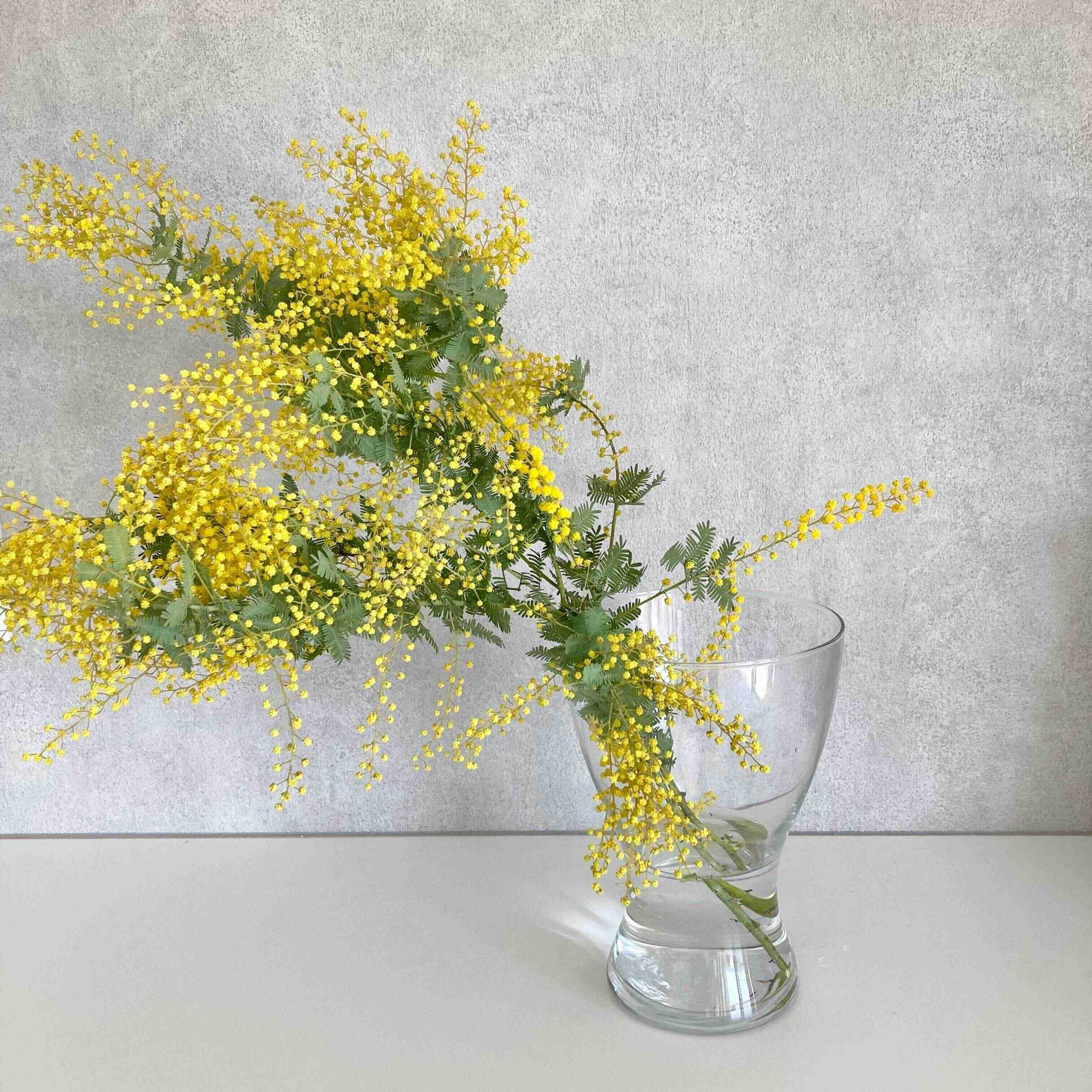 ミモザがだらんと倒れてしまっていますね。フラワーベースの口が広いタイプのものなので、どうしてもこのように倒れてしまいます。