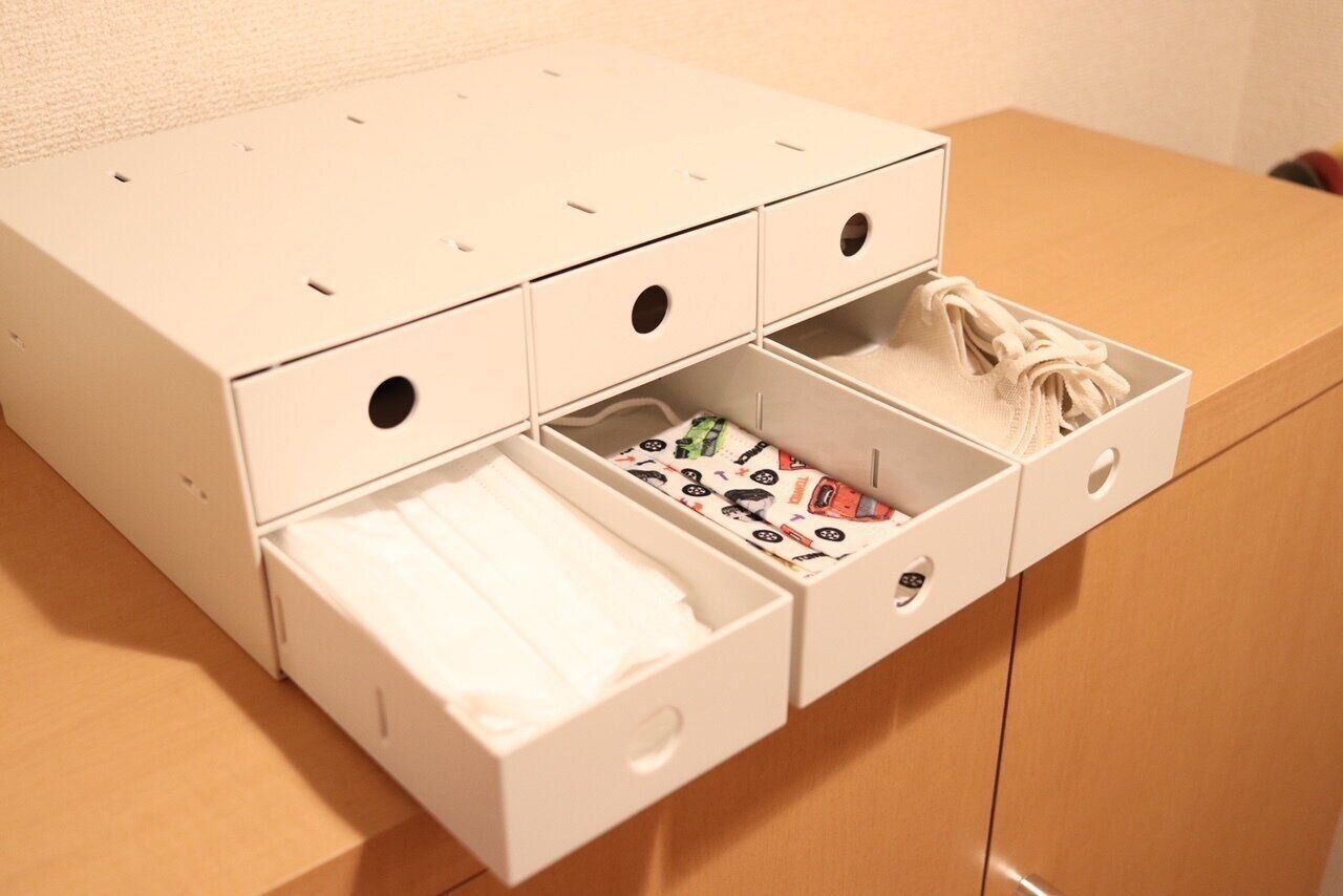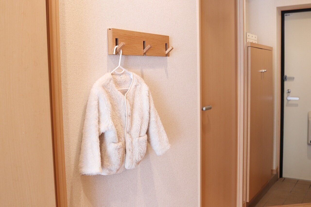 玄関に向かう途中の廊下には、壁に付けられる家具3連ハンガーを設置。おでかけ時に必要なカバンやアウターを吊るすことができるので、通るときにササッと身に着けられて便利です。そして、靴箱の上には無印良品のポリプロピレン小物収納ボックス6段を使い、忘れがちな家族分のマスクや印鑑、日焼け止めなどそれぞれ収納しています。また、玄関先に衣類クリーナーも置くのもおすすめ。気づいたときに服についたほこりやゴミも取り除くことができますよ。