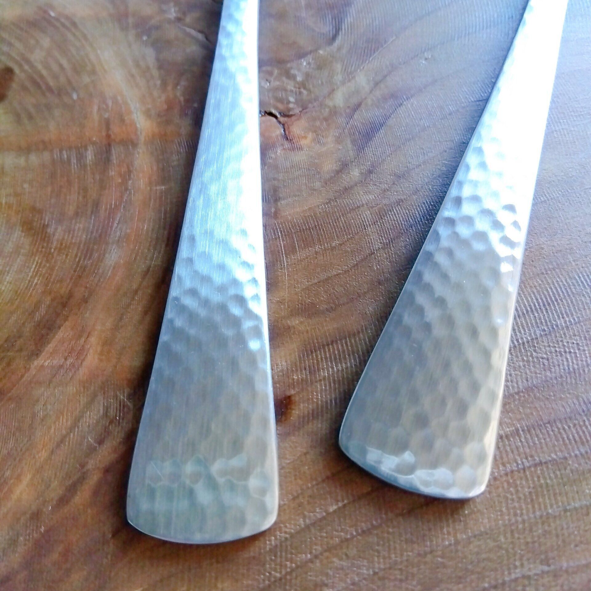 金属をハンマーで叩いて出したポコポコとした模様のことを「槌目(つちめ)」と呼びます。個性的なデザインですが、洋食はもちろん和食にも合う雰囲気が魅力のひとつです。