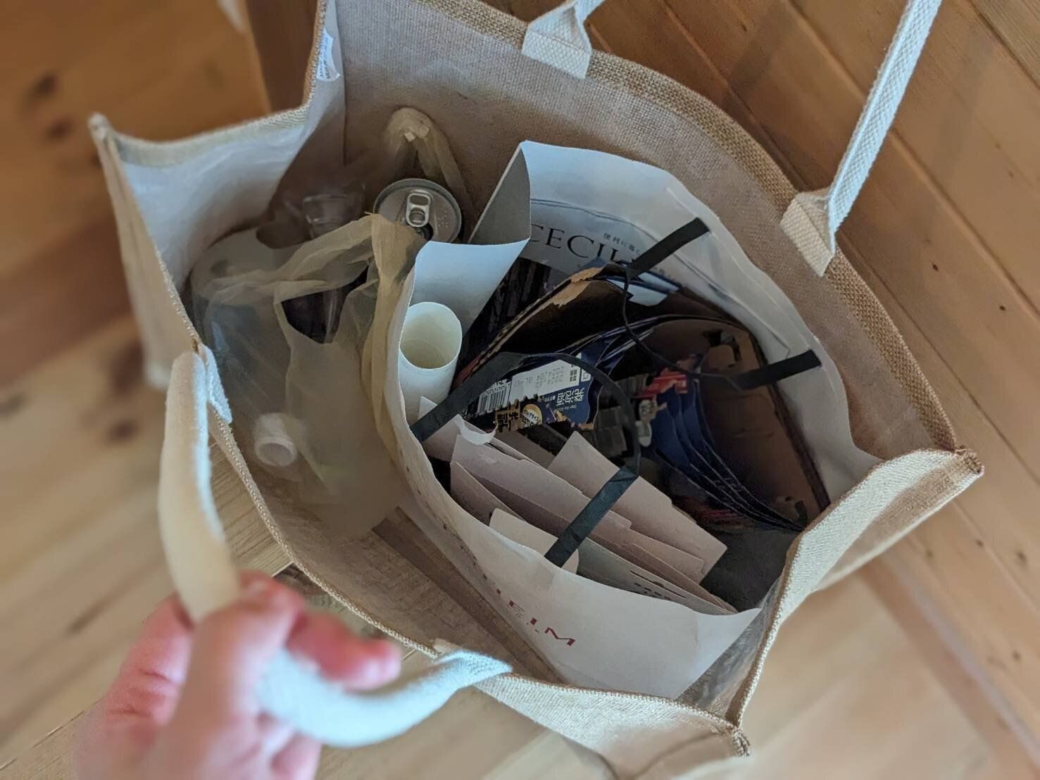 そこで、週に1回の買い出しの際に必ず資源ゴミを持参することにしています。無印良品の『ジュート マイバッグ』を資源ゴミ入れにしているので、資源ゴミ用にわざわざゴミ箱を準備する必要もありません。バッグを収納にすることで、そのまま持ち運べるメリットも!