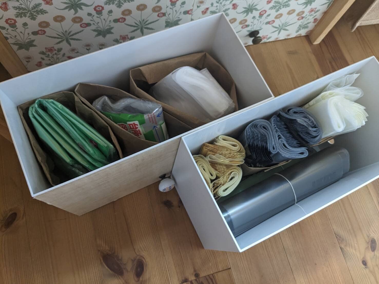 大きなケースの中に仕切りをつくりたい場合にオススメなのが、「紙袋」です。100円ショップのラッピングコーナーに行くと、大容量の「クラフトバッグ」がサイズ違いでたくさん並んでいます。