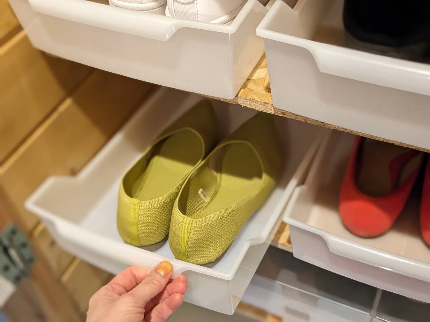 筆者宅では、このトレーに1足と決めて収納することで増えすぎを防止!1足増えたら1足手放す、「1 in 1 out」のルールにしています。トレーごと引き出すことで、靴裏の泥で靴箱を汚す心配もありません。