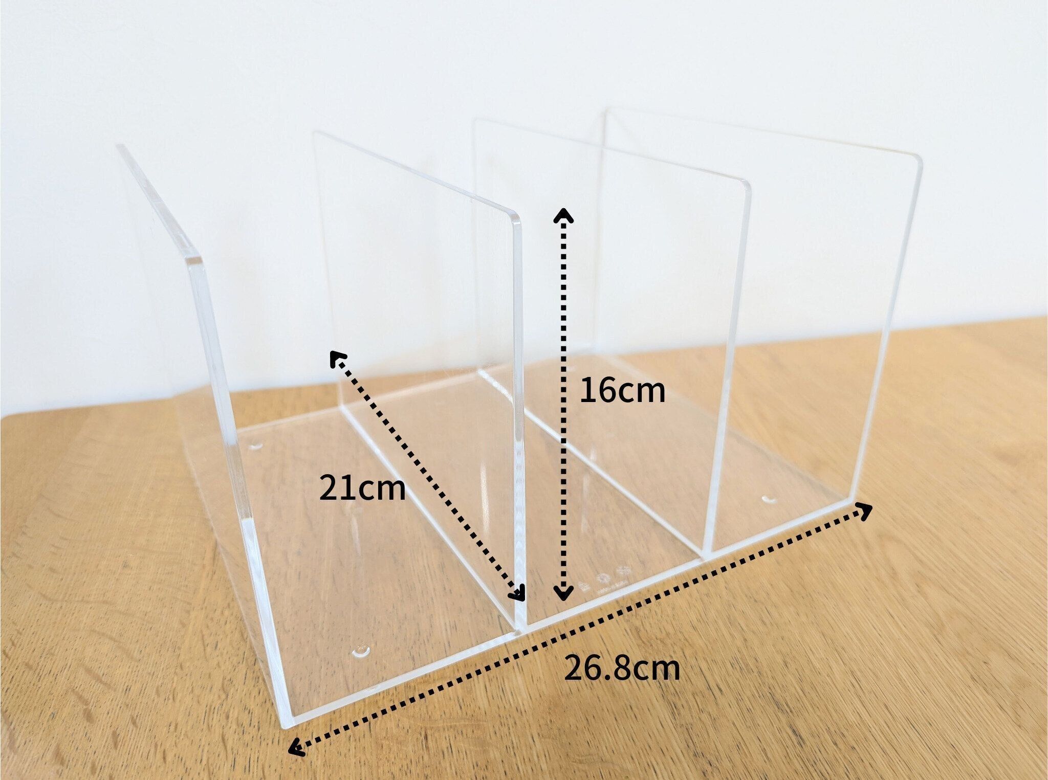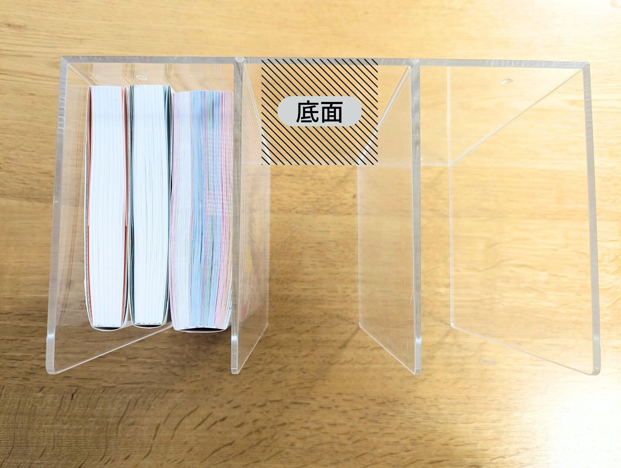 ブックエンド代わりに重宝しているのが、無印良品の「アクリル仕切りスタンド 3仕切り」(税込み 1,490円)。オープンボックス内に2つ使っています。