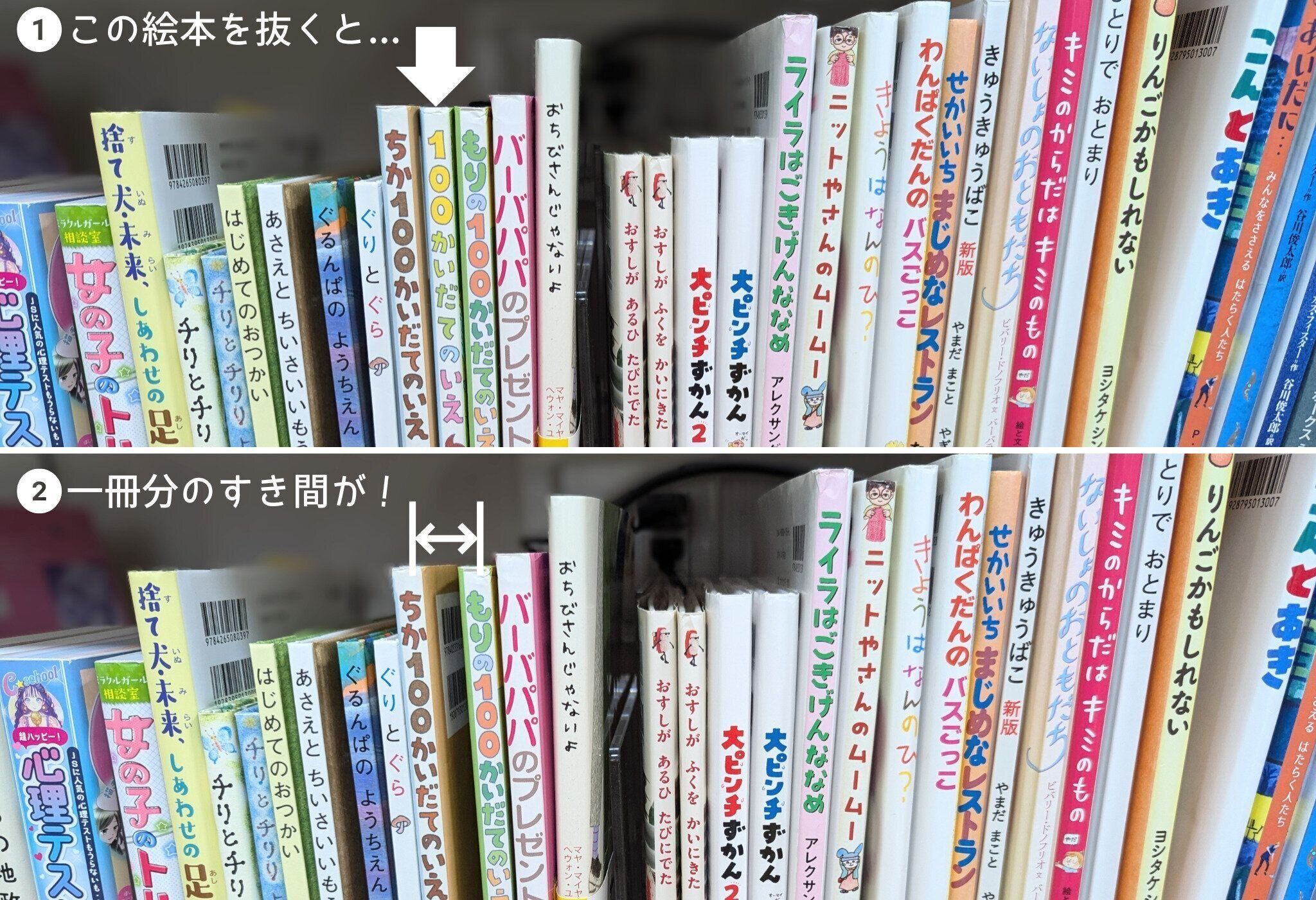 このスタンドは82mm間隔で仕切られていて、ひとつのスペースに入る絵本は6冊前後。1冊を引き出しても周りが横倒れせず、抜いた部分が「歯抜け」のようになるから、戻す位置が分かりやすい。透明で悪目立ちしないのも◎。