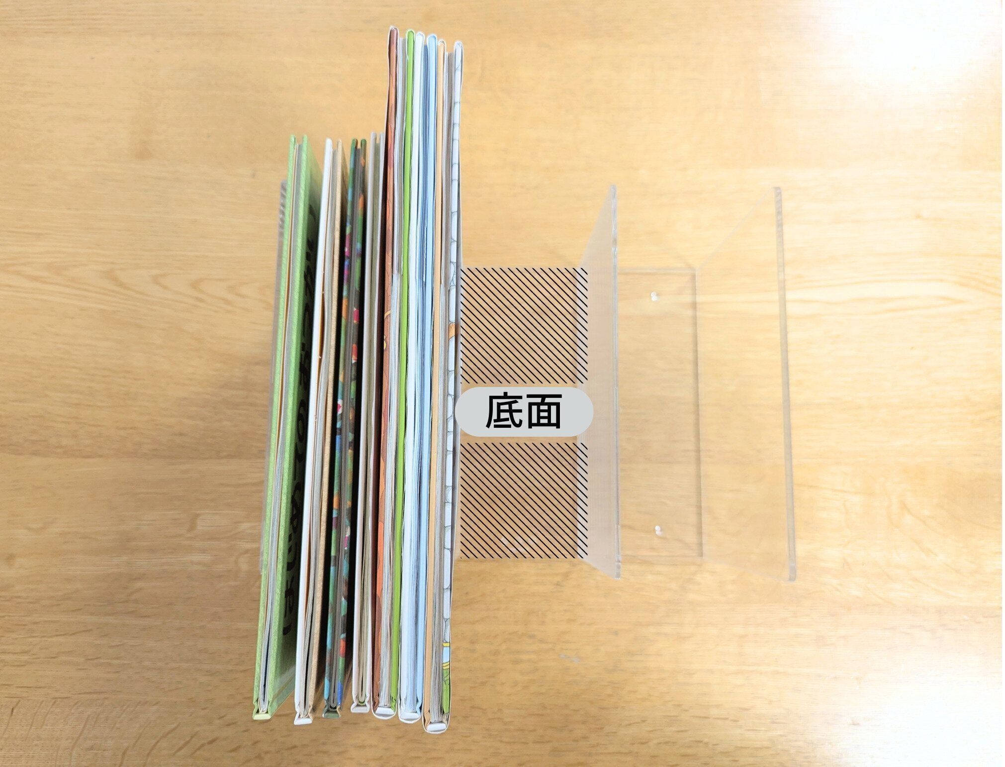 横長の絵本の場合は、元々の使い方通り、スタンドの底面を下に。長さ21cmの仕切りのおかげで、横長でも安定してスムーズに出し入れできるのはもちろん、サイズが異なる本同士も、手前に背表紙をそろえることですっきり見せられます。