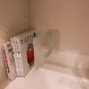 最近増えてきたコミックを収納するのにぴったりなのが、セリアの「背表紙が見えるブックスタンド」(JANコード:4905687294116、税込み 110円)。こちらもオープンボックス内に2つ使用中です。