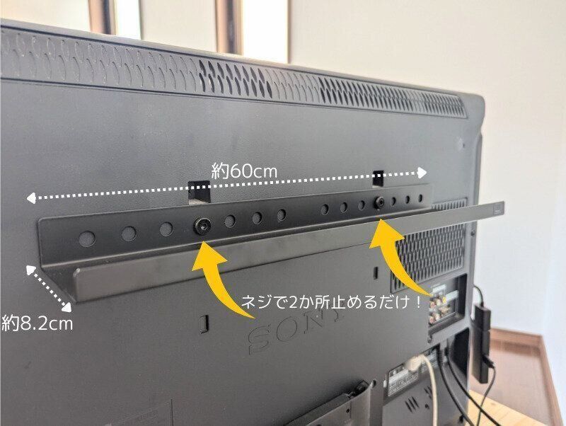 テレビ裏のネジ穴にねじ込むだけの簡単設置で、収納スペースがつくれる神アイテム。テレビのサイズに合わせて、幅は40cm、60cm、100cmの3種類から選べます。