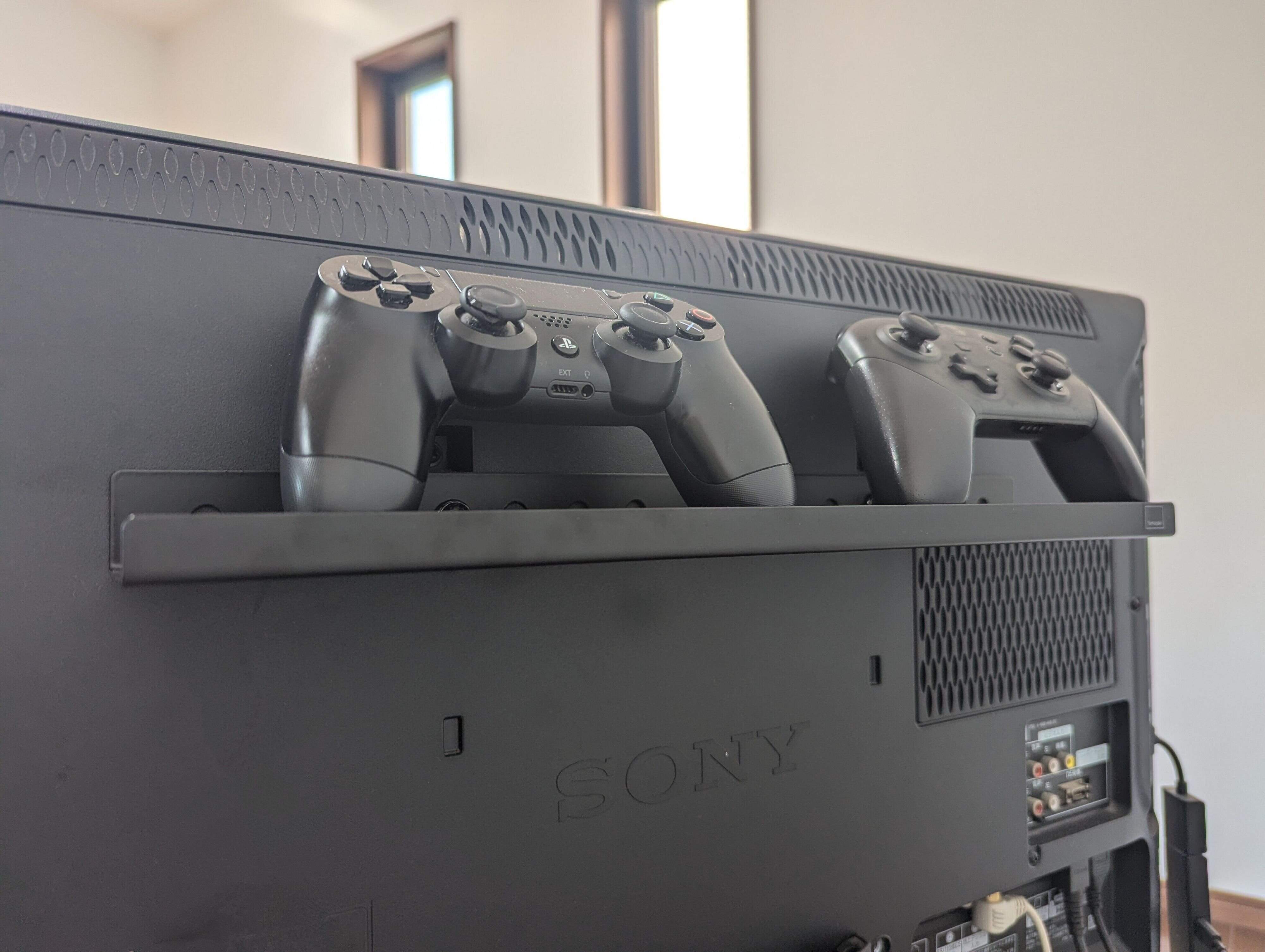 以前はコントローラーをカゴに入れて、テレビ下のオープンボックスに収納していましたが、カゴを引き出すのが面倒だったようで、出しっ放しにされがちでした。また、出し入れの際にコントローラー同士が触れ合うと、意図せずゲームが起動してしまうのもプチストレスだったよう。