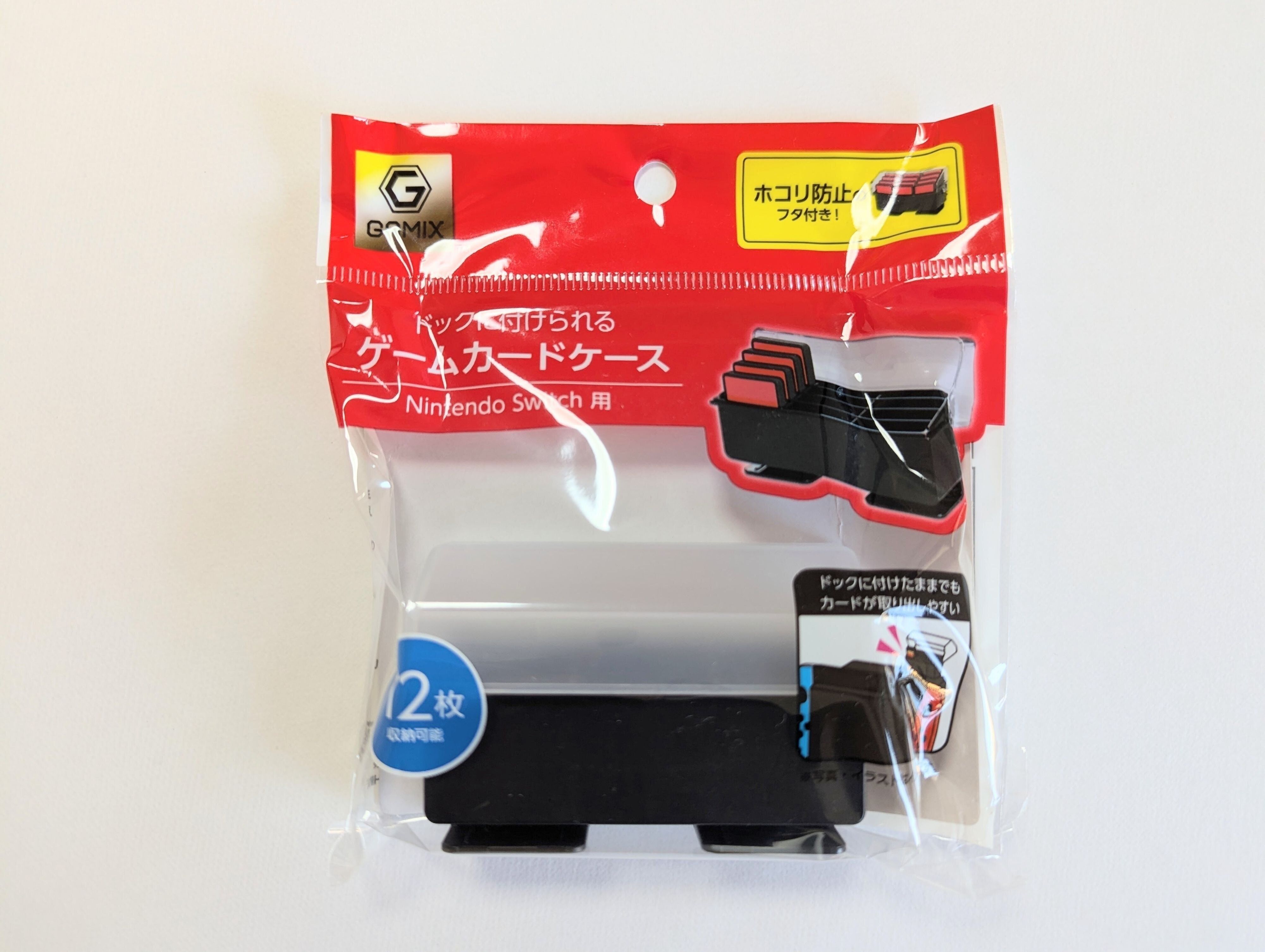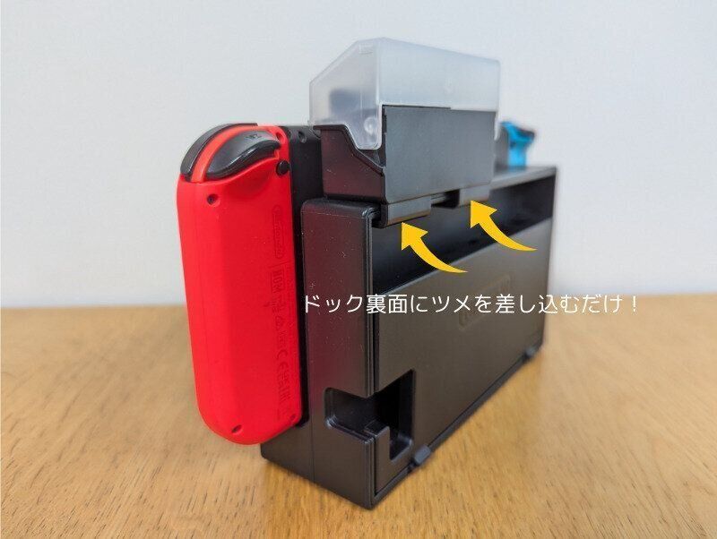 そこで購入したのが、セリアの「ドックに付けられるゲームカードケース(税込み 110円、JANコード:4905687353806)です。Switchをテレビでプレイする時に必要なパーツ=「ドック」の裏面上部に挿し込むだけで、ゲームソフトの収納場所が誕生!