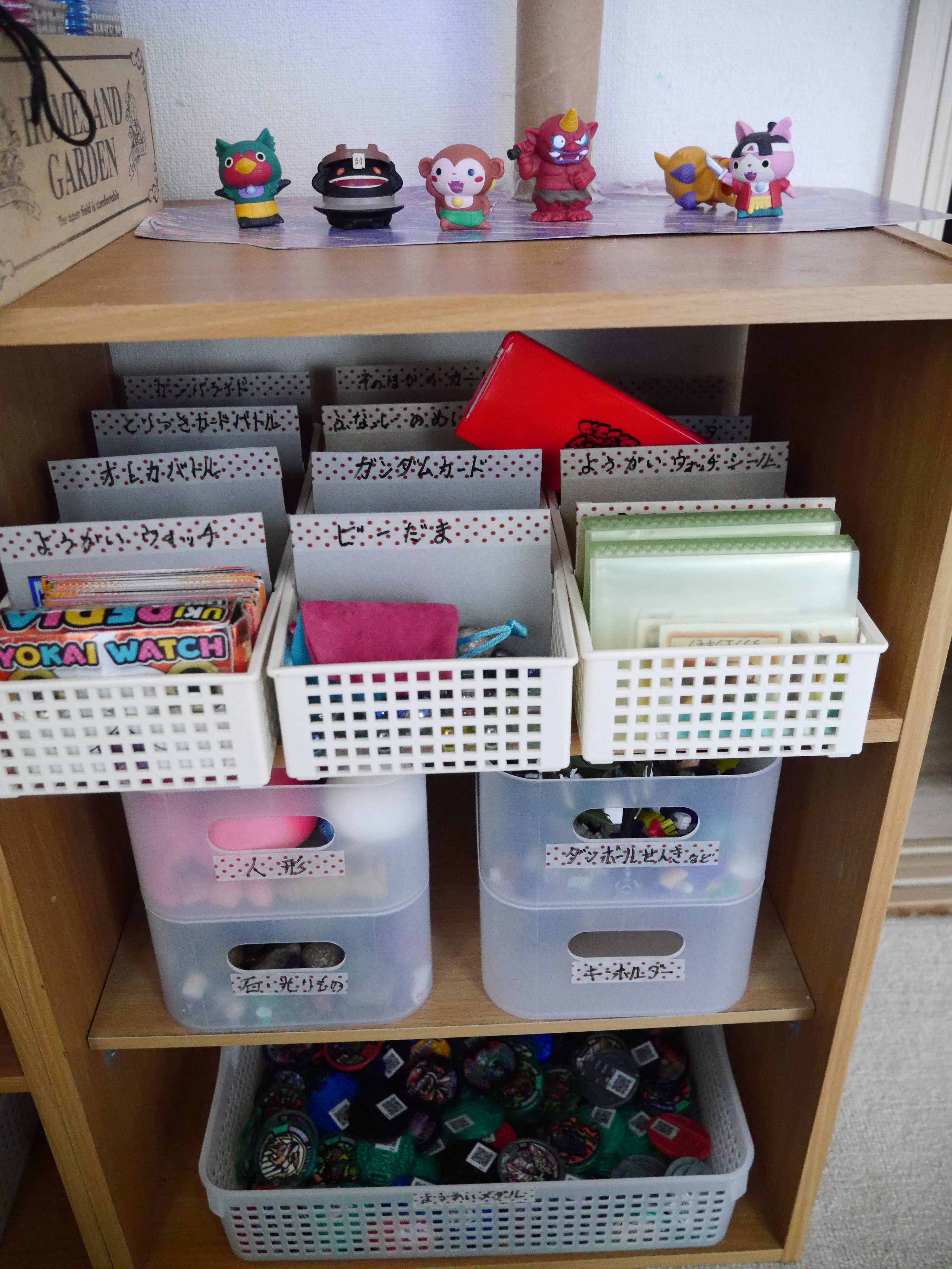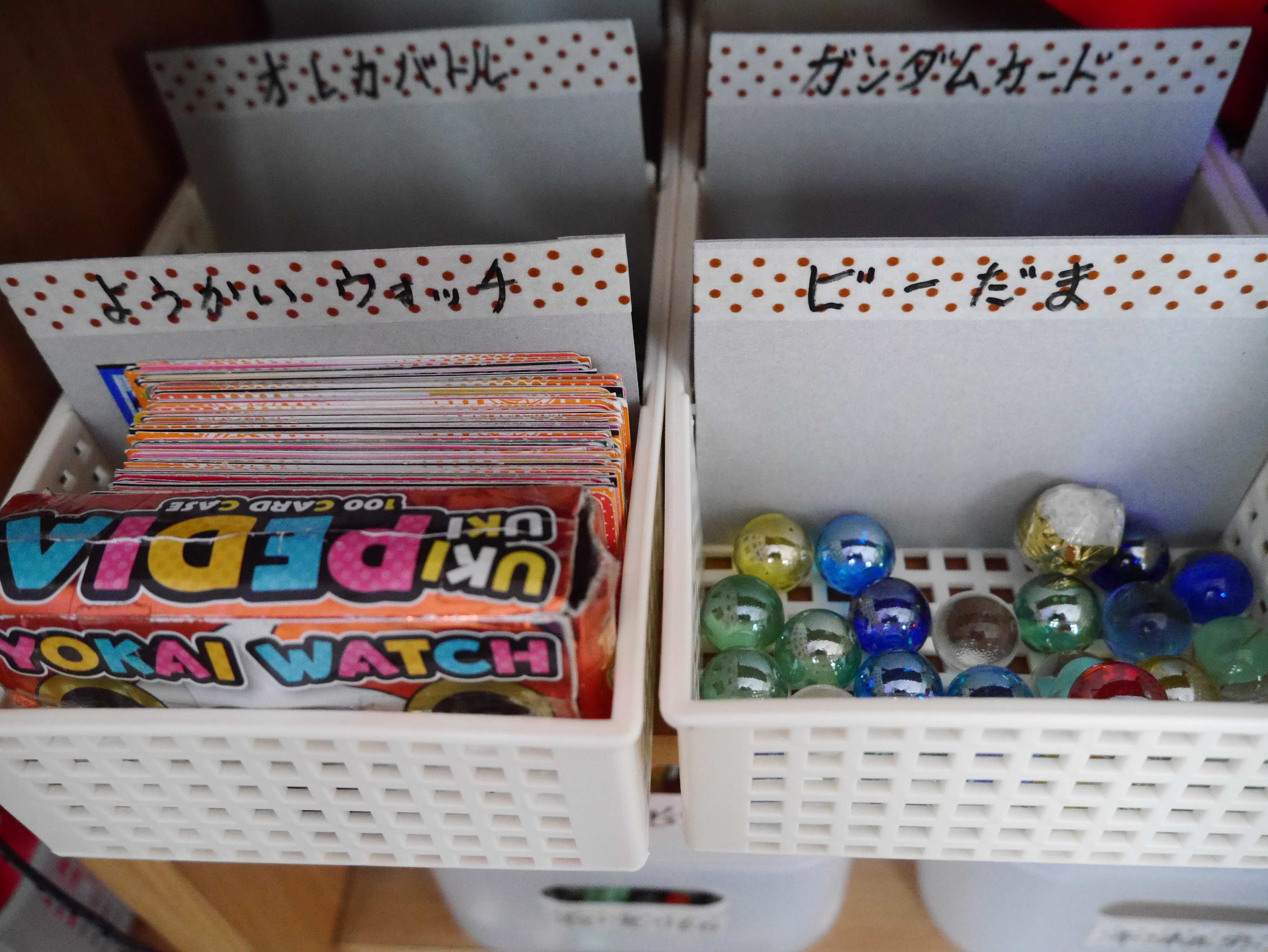 サンキュ!ブロガーみい太さんは、100均アイテムでおもちゃ収納を見直しました。カード類はインデックスをつけた仕切りつきボックスに、メダル類はプラカゴに。キーホルダーなどは、重ねられるボックスに。面倒くさがりな子どもたちのために、「入れるだけ」かつ「透明・オープンでひと目で探せる」収納になっています。