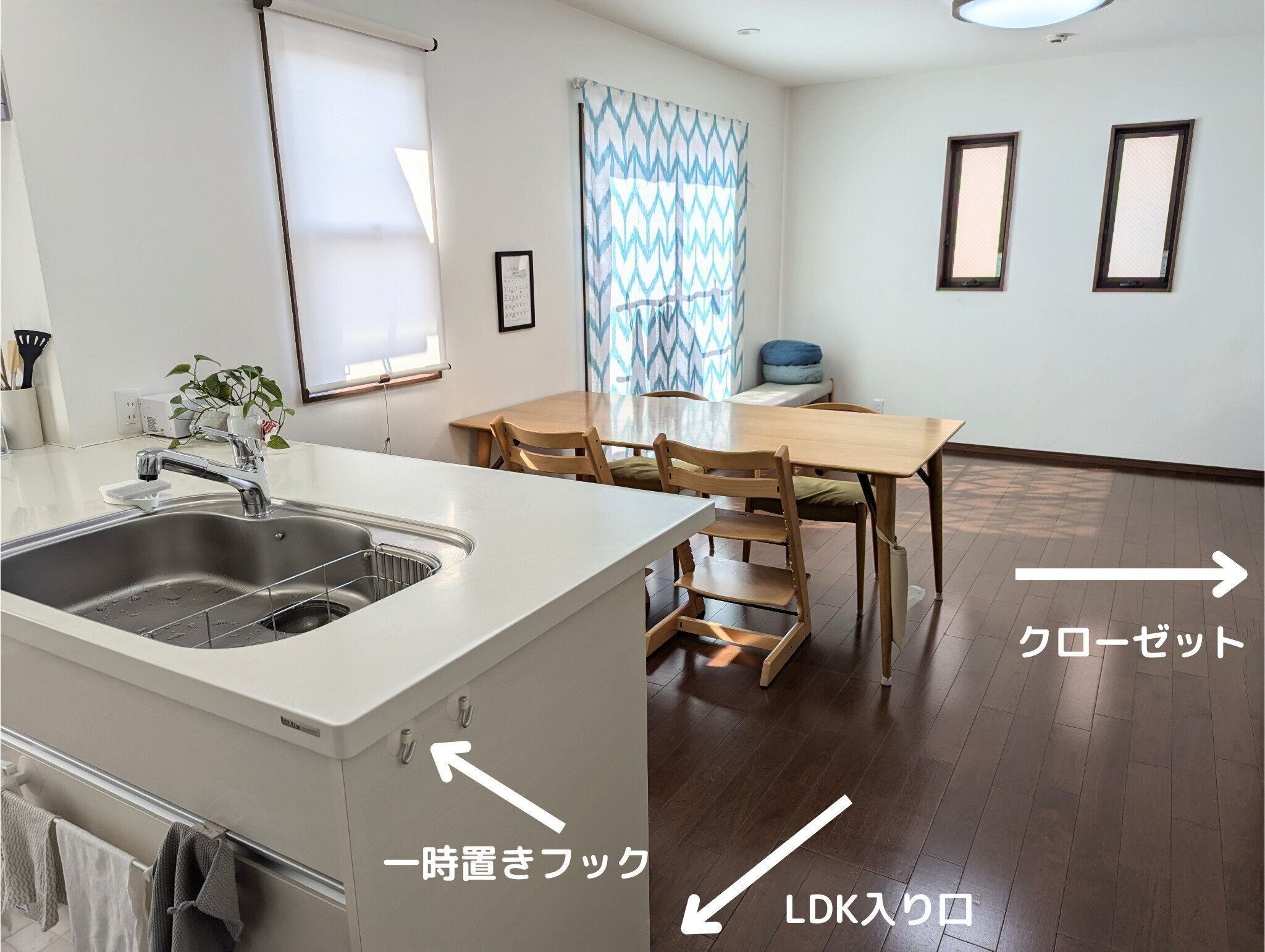 そこで、自分の家の中での行動を振り返ってみることに。帰宅後はまず洗面所で手を洗い、そのままLDKに直行するのがいつものパターン。購入品などを片づけてから次の行動に移るのですが、このとき、わざわざバッグをクローゼットに置きに行くのが面倒で、つい手近なフックにかけて、そのまま放置しがちでした。