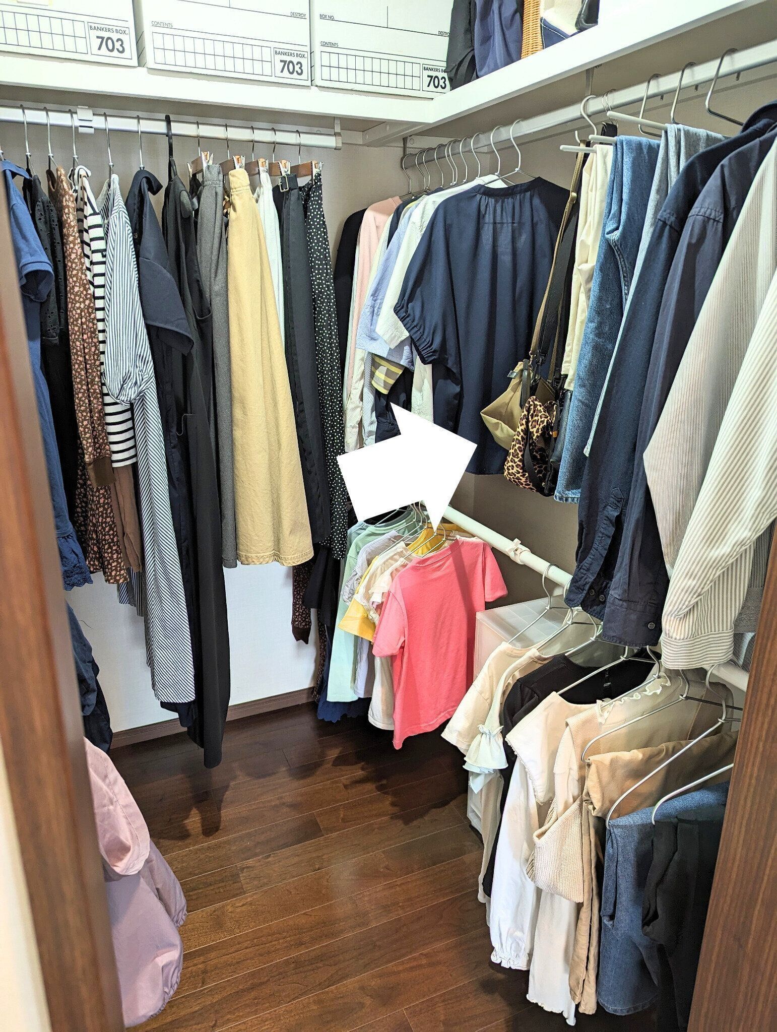 寝室の続きにあるクローゼットが定位置でした。理由は、洋服と同じファッションアイテムだから。出かけるときにここからバッグを選んで、帰宅後に同じ場所に戻す流れを想定していたけれど、実際はキッチン横の一時置きフックにかけたままのことがしょっちゅう。