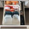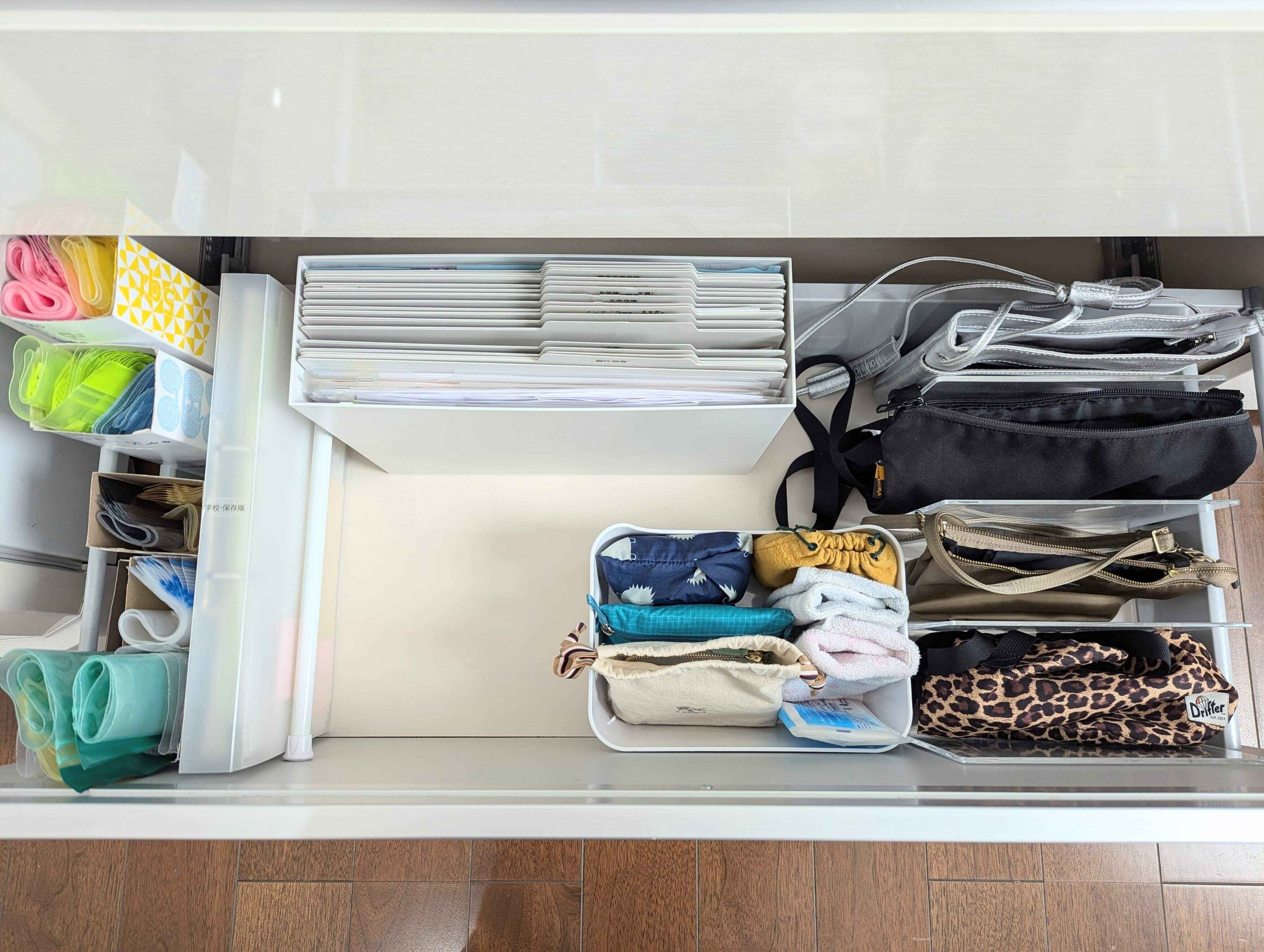 少しスペースがあったキッチン背面の引き出しを活用しています。三段のうち一段目にはカトラリーと保存容器、二段目にはお菓子&飲み物と、一般的なキッチンまわりのアイテムを収納していますが、三段目だけは異色の用途。