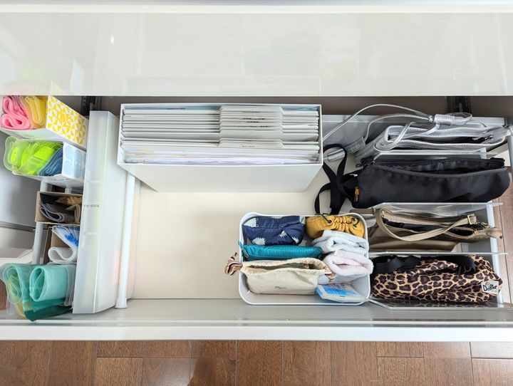 ここに、ふだんの外出で使うショルダーバッグ4つを、無印良品の「アクリル仕切りスタンド(1,490円)」に立てて収納しています。仕切りがあると、倒れたり、取り出すときに隣のバッグまでいっしょに出てこずストレスフリー。