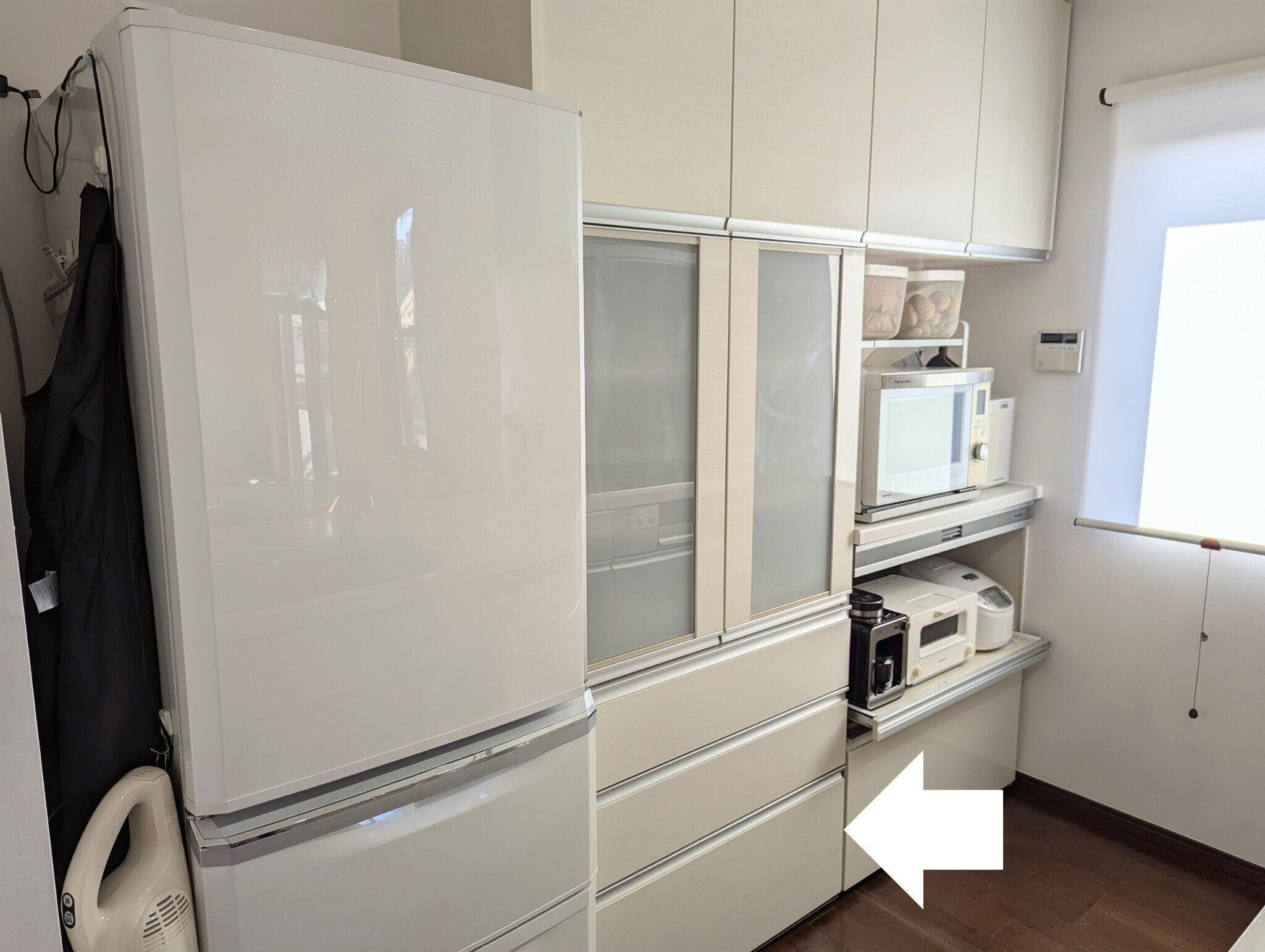 帰宅後に必ず通る場所に収納を設けたことで、バッグの「ちょい置き」が激減。たまにあっても、元に戻すまでの時間がこれまでより圧倒的に短くなりました。理由は、頻繁に使うキッチン内に収納があるおかげで、1日のなかに何度も片づける機会があるから。