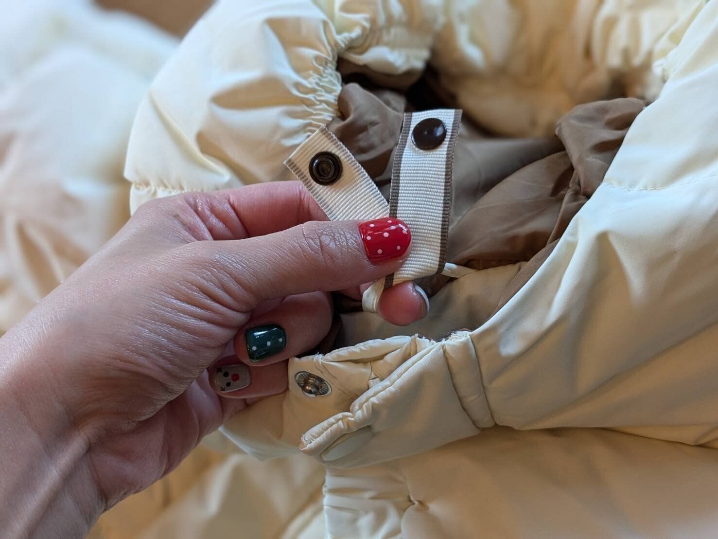 「ネームタグ」は最初から「スナップボタン」の付いたデザインなので、長さを調節したりと面倒な作業が発生しないのもうれしいですね。もちろん、本来の用途通りにここに記名もしておけば、アウターをなくさずに済みます。付け外しがラクなので、使い回しできるのも助かりますね。