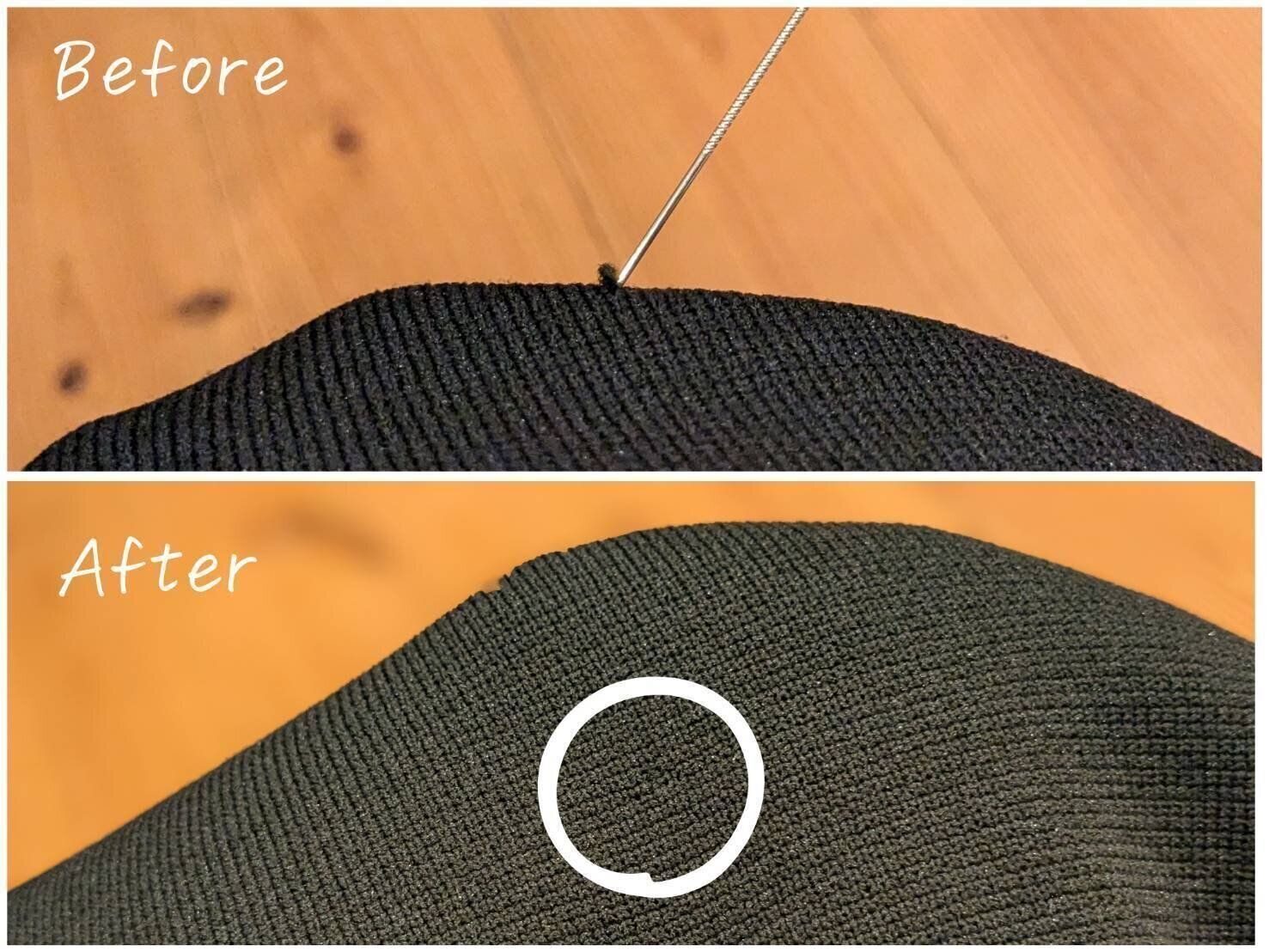 肝心の仕上がり具合ですが、文句なし!どこがほつれていたのか、補修した自分自身分からなくなるほどの仕上がりです。試しに夫に補修後の服を見せてみましたが、補修箇所を見破られることはありませんでした。これだけ手軽に補修できるとあれば、冬の必需品として一家にひとセット置いておいて損はありません。