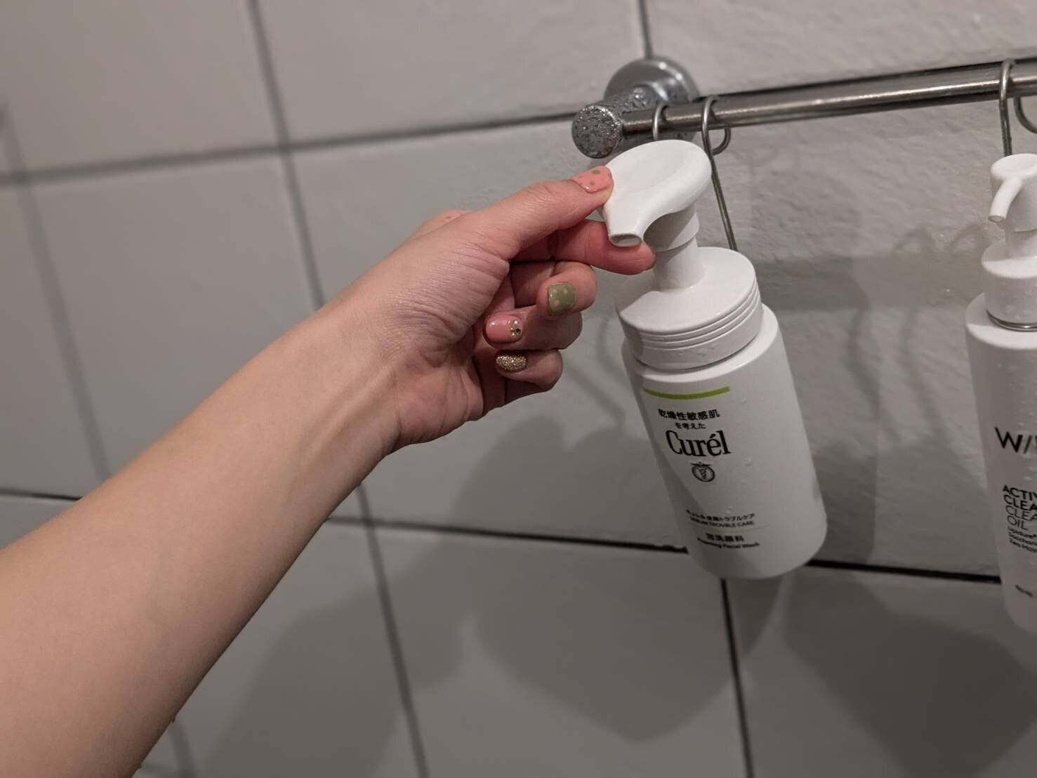 続いて紹介するのは、「泡洗顔料」や「クレンジングオイル」などのボトルを浮かせる収納にできる『ハンギングステンレス泡ボトルホルダー』(110円)。ボトルの口の大きさに合わせて、2サイズ展開で販売されています。