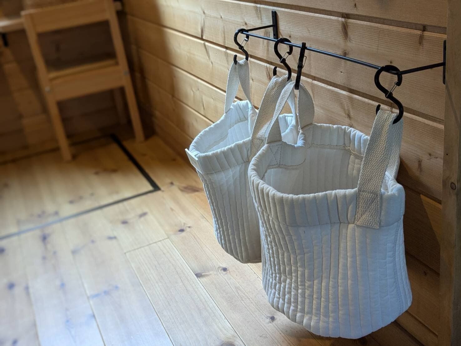 筆者宅では、洗面脱衣所で「浮かす収納」にしている子どものパジャマ入れにも、このS字フックを使用しています。パジャマ入れとして使っているバスケット自体は、鍵のように取り外すモノではないですが、ふつうのS字フックでは、子どもがパジャマを取り出すときにバスケットが揺れて、フックが落ちることがよくありました。
