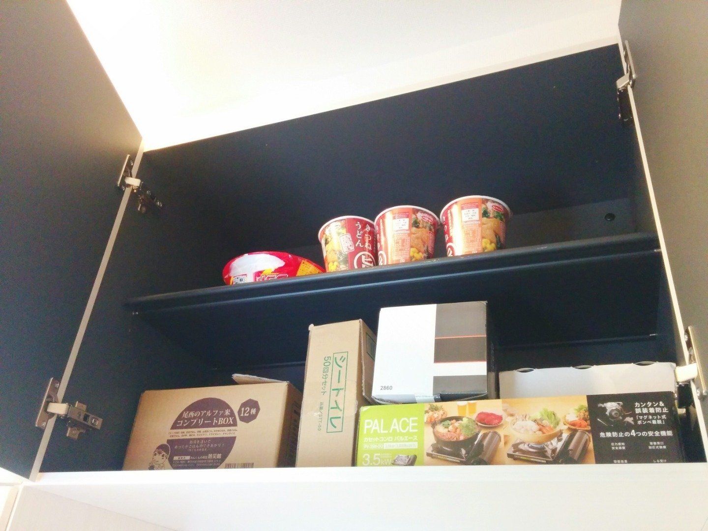 手の届かない収納スペースには非常食をストック