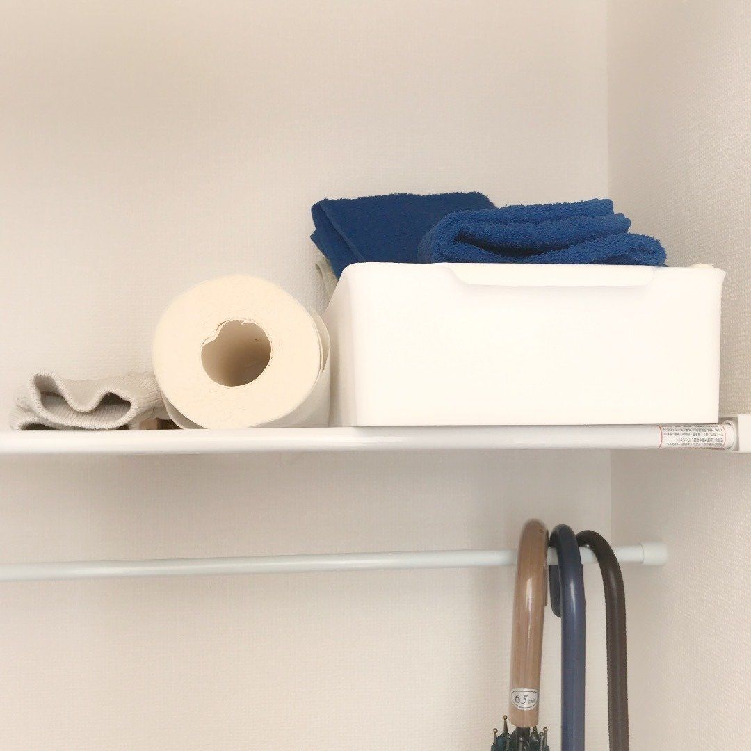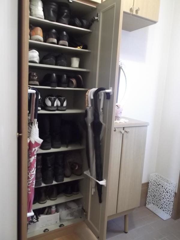 玄関にある土足収納スペースにつっぱり棒をし、簡易的な棚をつくっているようです。棚には洗車用具を置き、使わないときはカフェカーテンで見えないようにしているのだとか。つっぱり棒を使い、傘をかけてスッキリ!空間を上手に活用していますね。