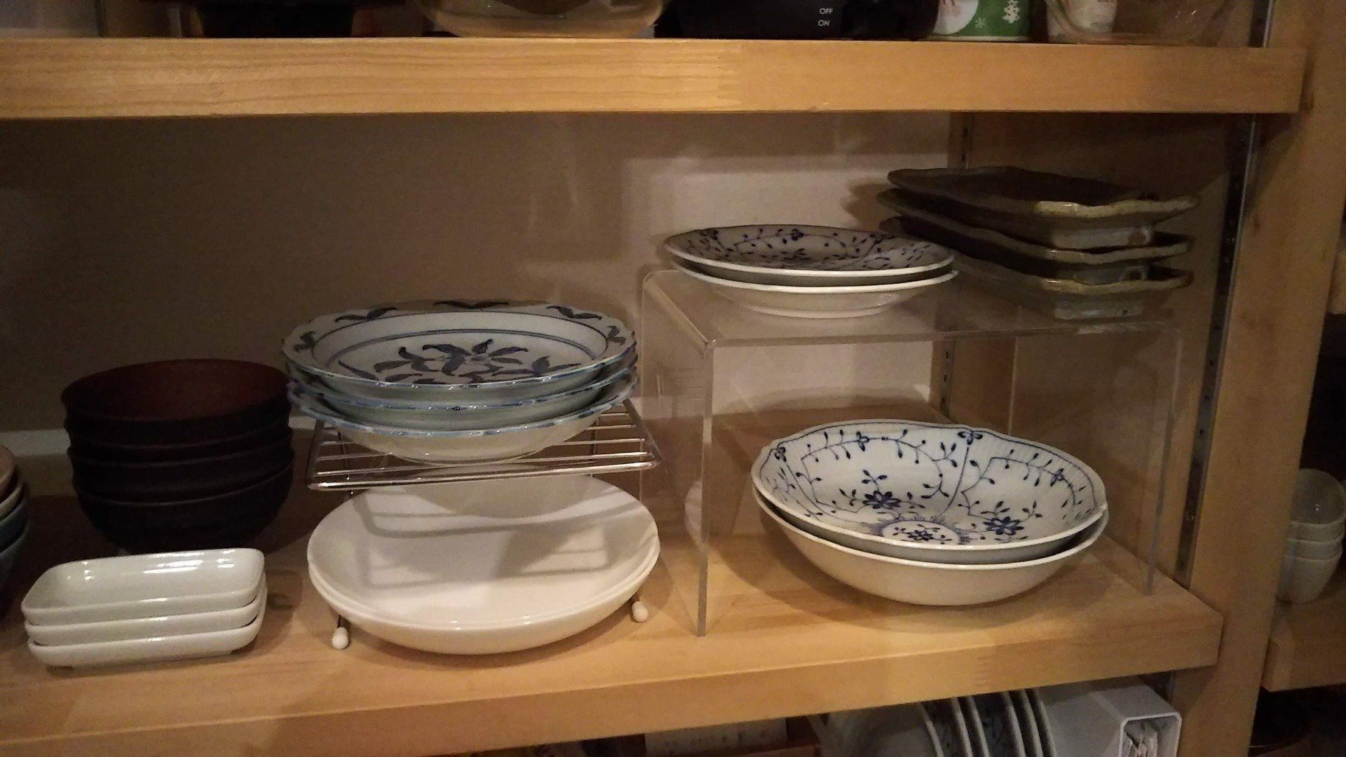 そのまま食器棚に収納すると、高さがそろわずムダな空間ができてしまう食器。まっこいさん宅では、アクリル製の仕切り板を使って上下2段に収納できるようにしています。透明なので何がしまってあるのか一目瞭然!下の段の食器は小型収納ボックスに入れると、手前に引き出せてより取り出しやすくなるそうです。
