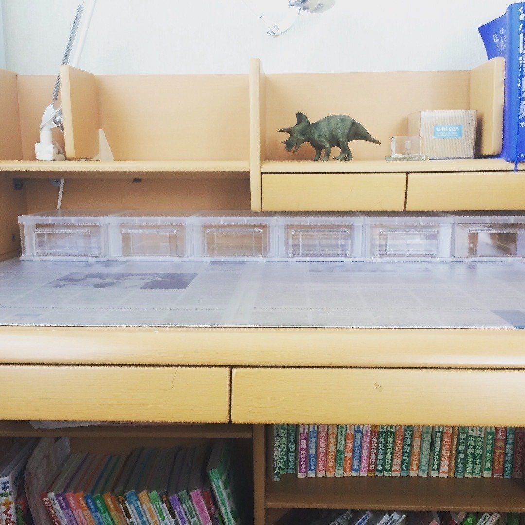 子ども用の学習デスクって機能的な一方、微妙なスペースがあるものですよね。デッドスペースでも、有効活用するのが収納の基本です。ななせさん宅では、100均の小引き出しをつけて、備えつけの引き出しに入っていた小物をIN。透明の引き出しだから、何がどこに入っているのかも一目瞭然になったそう。
