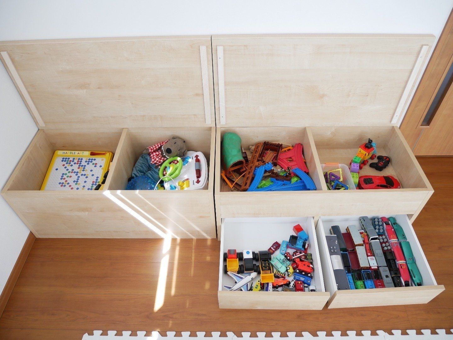 本当は、毎回片づけたほうがいいけれど、なかなかうまくいかないもの。そこで中島愛さん宅では、「夜21時になったら片づけをする」という1日1回の片づけ時間を決めたそうです。こうすると遊んだものは、自分たちで片づけるクセがつくんだとか。さらに忘れてはいけないのが、ほめること!毎回だとママがたいへんなので、ときどきでもOKだそうです。