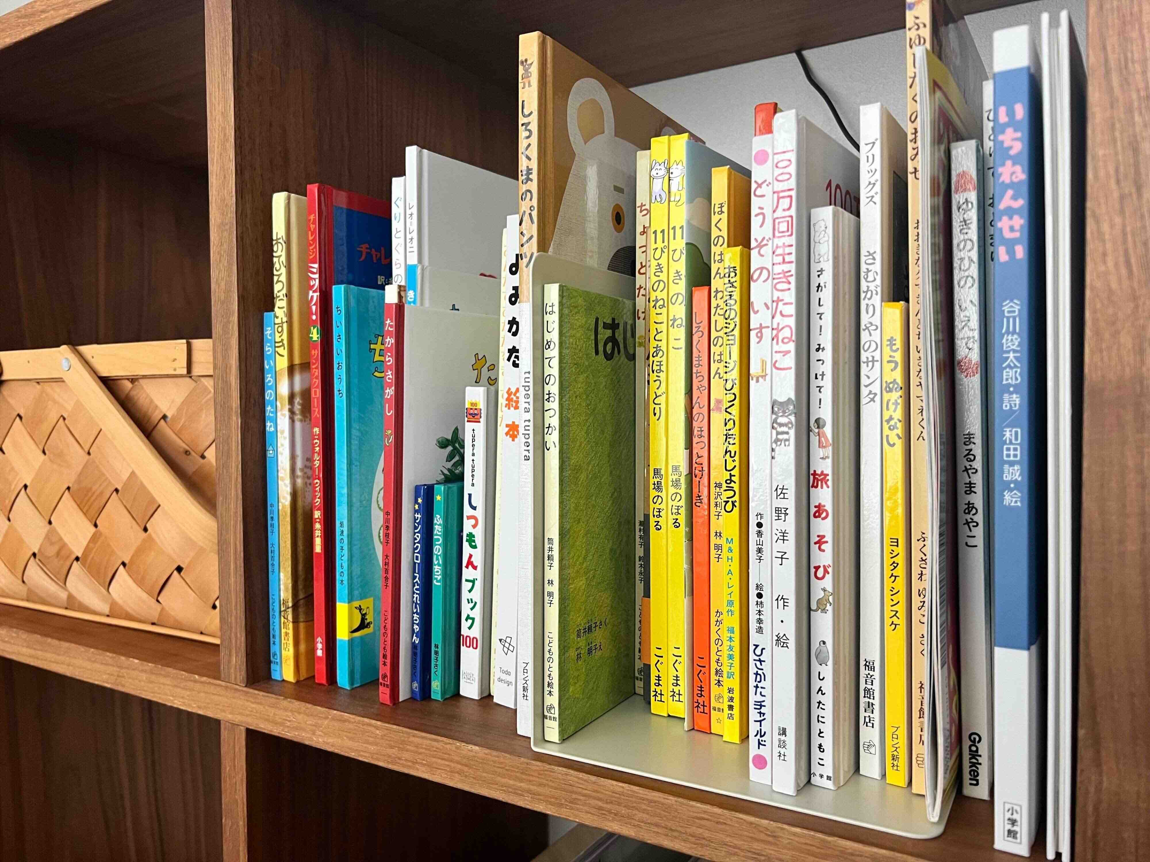 そんな時のために、「こんなこともあろうかと!」といった感じで、間にブックエンドを仕込んでおいてみてください。絵本が倒れてくるのを防いでくれるので、きっと後片付けが楽になりますよ。