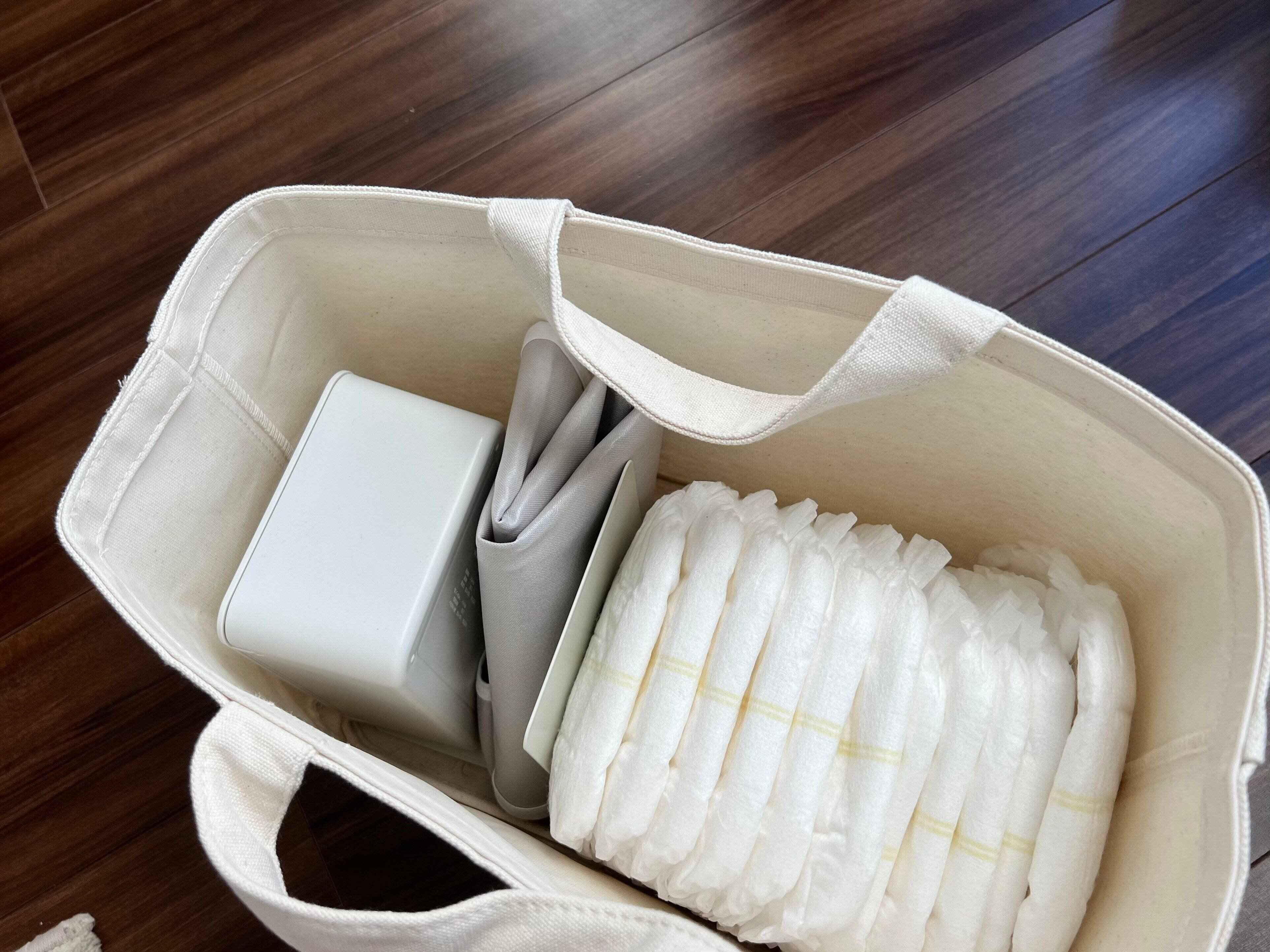 この中におしり拭きとおむつ替えシートも一緒に入れておくと便利です。同じタイミングで使う物は一緒に収納しておくことで、使いやすさがアップ。また、おむつが減り倒れてくるのをブックエンドが防いでくれるので、その点でもストレスフリー!