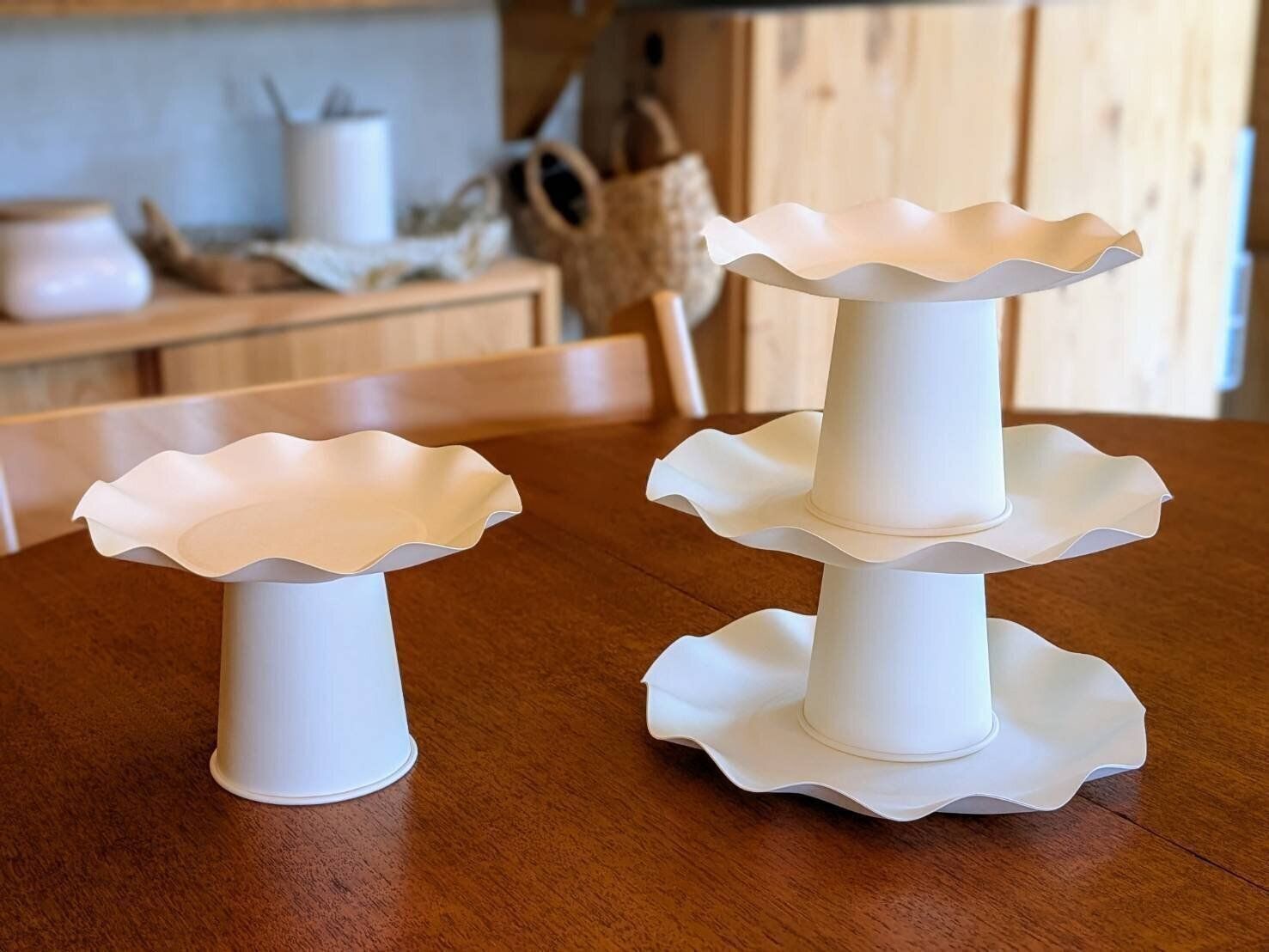 ご自宅に余っている「紙コップ」はありませんか?紙皿と紙コップをテープでとめるだけで、一瞬で「なんちゃってケーキスタンド」の完成です。