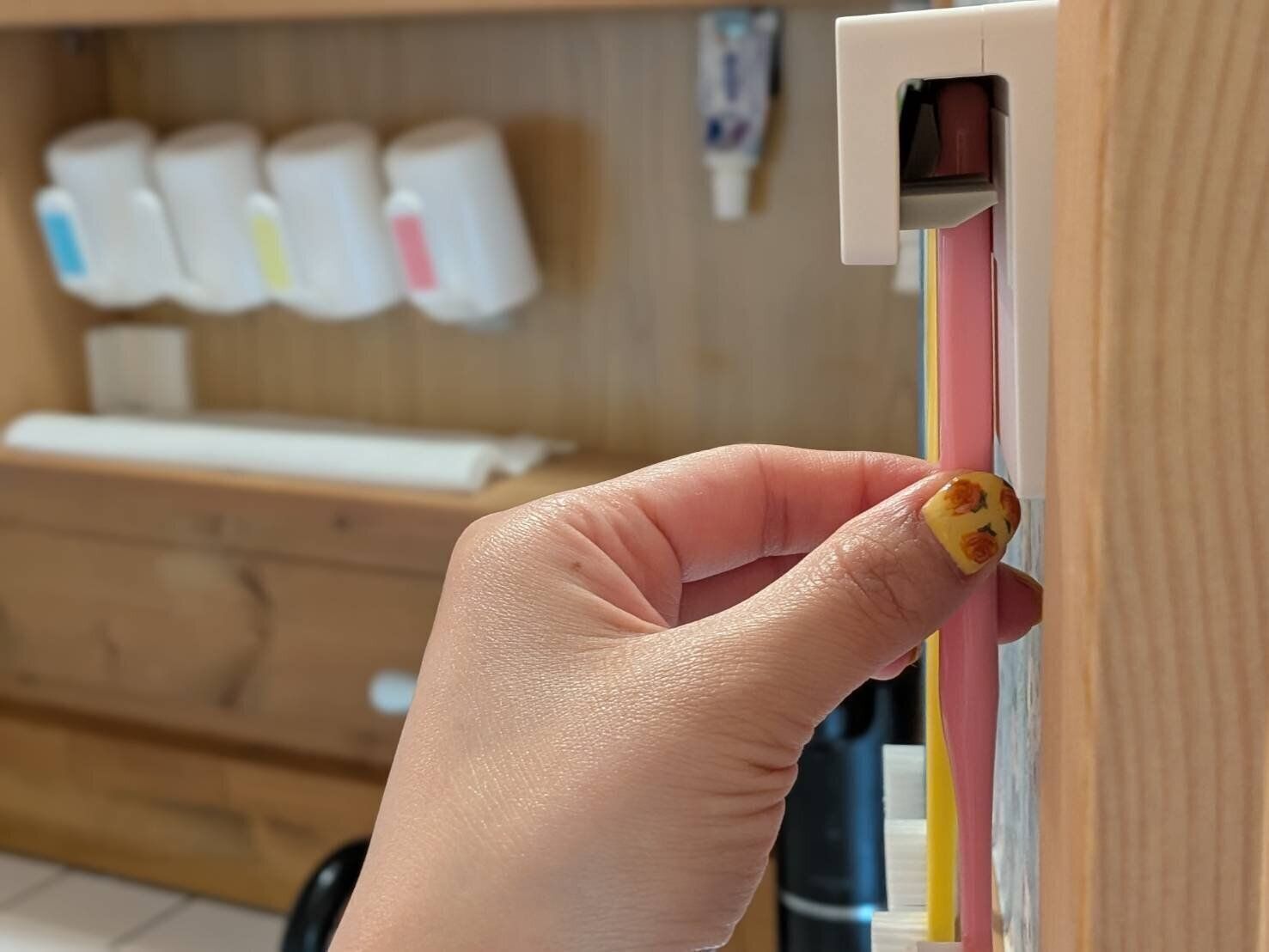 今まで試した商品はどれもブラシ部分がホルダーにつく構造で、衛生面が気になっていました。稀にブラシに残っていた歯磨き粉が固まってつくこともあり「歯ブラシホルダーを拭く」という新たな家事を増やしてしまったことも。
