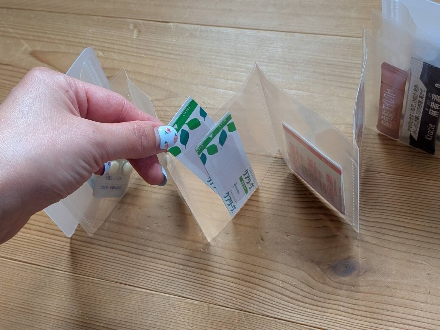 カードを入れるためのモノとあって、カードよりもひと回り大きいサイズ感。小さなバッグに入れても邪魔にならないサイズにも関わらず、「常備薬」や「絆創膏」、「ヘアゴム」に「コンタクト」などの小さな小物をしっかりと分けて収納することができます。
