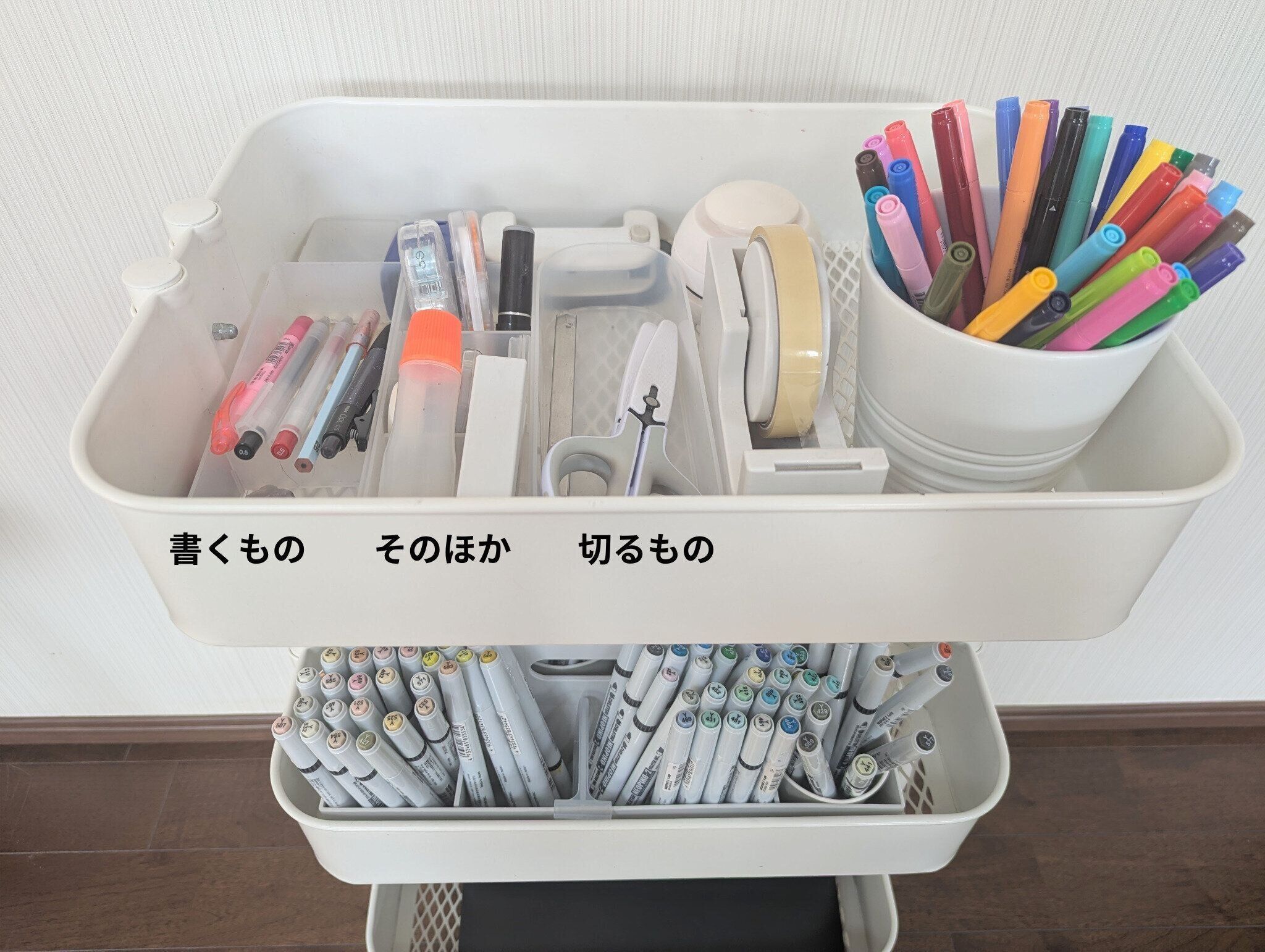 ワゴンの中は、無印良品の「ポリプロピレンデスク内整理トレー3」(190円)などを使って、用途別にゆるっと分類。