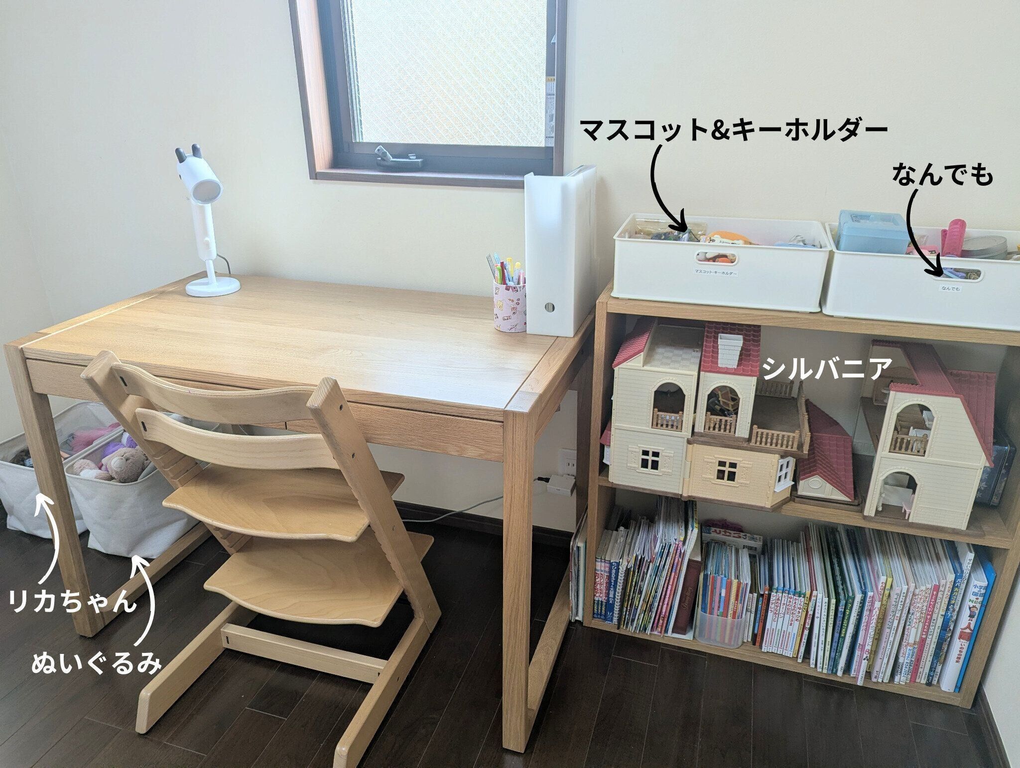 そこで著者が意識しているのが、分けすぎないこと。特に次女は根っからの「ざっくり派」なので、小3になった今でも、箱は「ぬいぐるみ」「リカちゃん」「マスコット&キーホルダー」「なんでも」の4つだけ。これくらいの数だと考え込まずに戻せるようです。