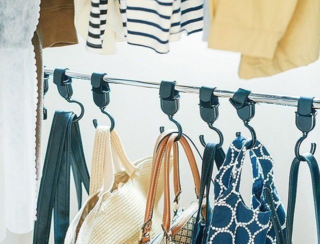 吊るすといえばS字フックですが、吊るす向きが変えられないから不便な場合も。そんなときはベビーカー用の回るフックが◎。クローゼット内でもバッグの向きが統一できて便利です。