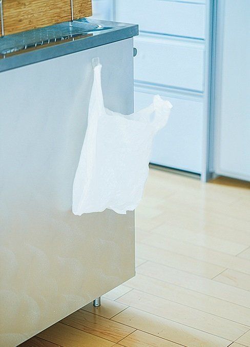 掃除や片づけの動線上にゴミ箱があるとすごく邪魔。そんなときは、シンクわきにつけた透明フックにビニール袋を吊るしましょう。量がまとまったら口を縛り、キッチン奥のゴミ箱に。