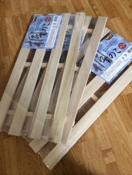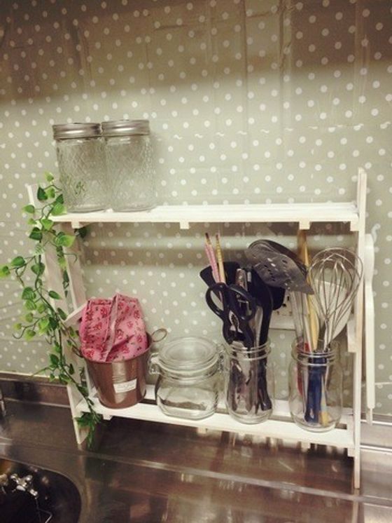こちらもサンキュ!トップブロガーまるやま ひろこさんのDIY。100均で購入した細長いすのこ2枚を半分にカットしてねじで固定。スプレーペンキで白に塗れば、素敵なキッチン用収納棚の完成です。