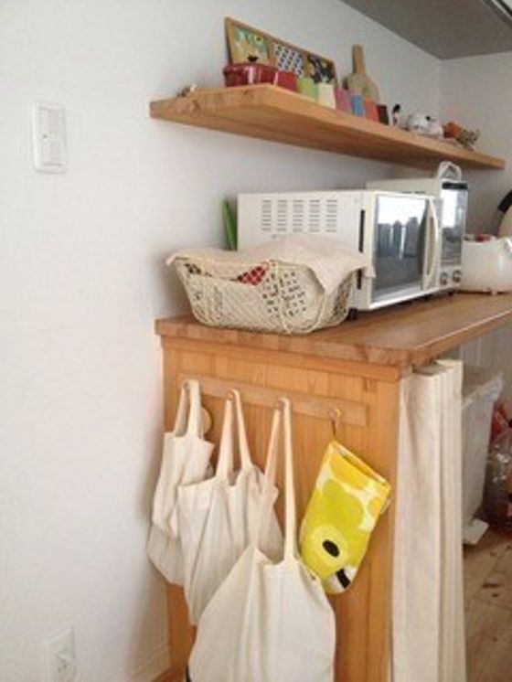 置き場所にこまりがちなエコバッグ。サンキュ!ブロガーのトムトムさんは、セリアの木製フックを活用し、キッチンやリビングにさりげなく収納しています。