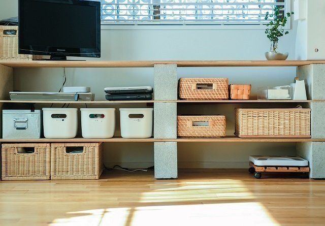 定期的に収納かごの中を見直して、物が減ったらかごごと処分すれば、油断して物が増えることもなし。「板+ブロックの手作り棚だから、もっと減ったら棚1段減らすことも可能です」。