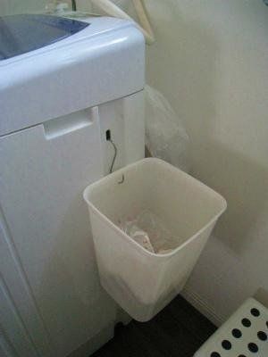 洗面所にごみ箱を置くと本当に便利ですが、床の湿気やホコリが心配なもの。そこでごみ箱に穴をあけ、洗濯機にS字フックを装着。ごみ箱を吊るしておくことで、子どものイタズラにもあいませんし、ごみも捨てやすくなります。